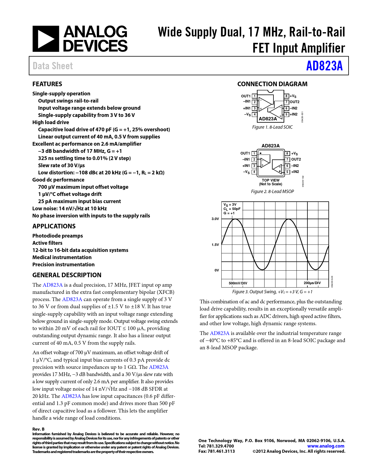 Wide Supply Dual, 17 MHz, Rail-to-Rail. FET Input Amplifier. Data Sheet. AD823A. FEATURES. CONNECTION DIAGRAM