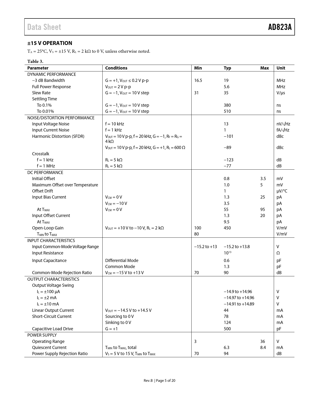 Data Sheet. AD823A. ±15 V OPERATION. Table 3. Parameter. Conditions. Min. Typ. Max. Unit