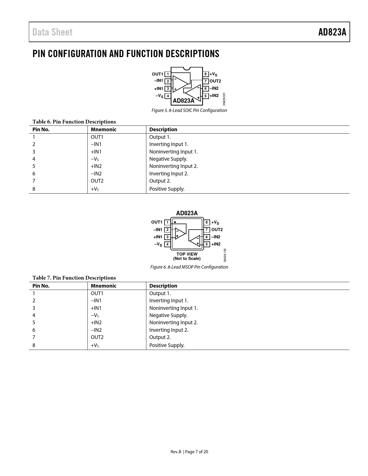 | Seiten / Seite | 20 / 7 — Data Sheet. AD823A. PIN CONFIGURATION AND FUNCTION DESCRIPTIONS. OUT1 1. … |