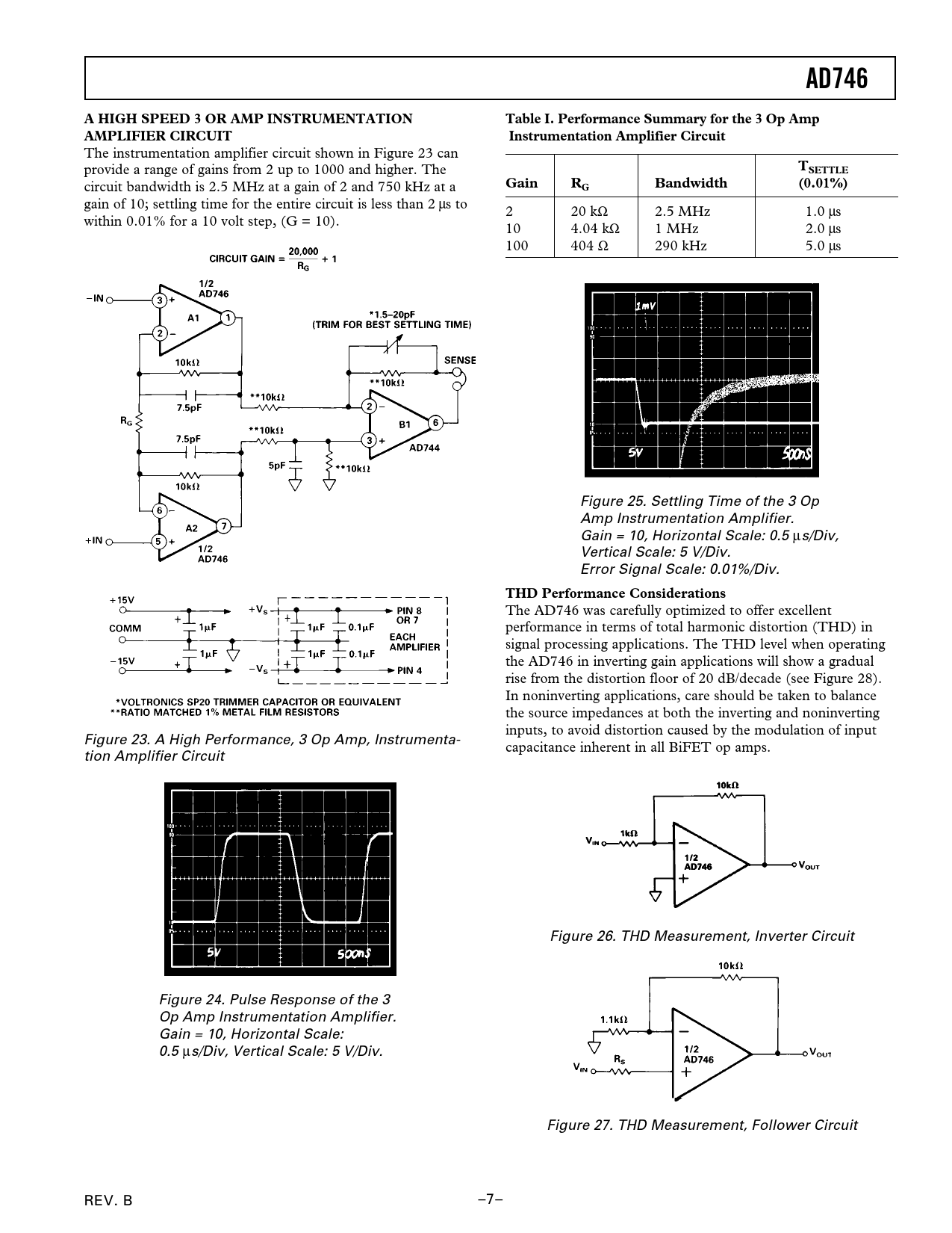 AD746 A HIGH SPEED 3 OR AMP INSTRUMENTATION Table I Performance Summary for the 3 Op Amp AMPLIFIER CIRCUIT