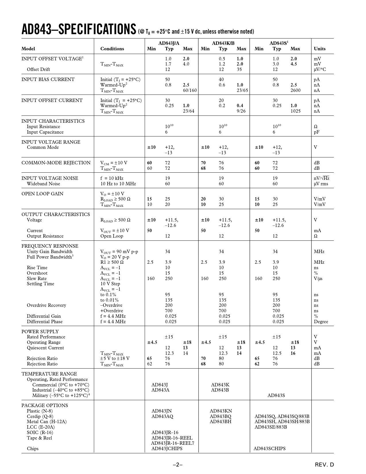 76 dB TEMPERATURE RANGE Operating, Rated Performance Commercial (0°C to +70°C) AD843J AD843K Industrial (– 40°C to +85°C) AD843A AD843B Military (–55°C to +125°C)4 AD843S PACKAGE OPTIONS Plastic (N-8) AD843JN AD843KN Cerdip (Q-8) AD843AQ AD843BQ AD843SQ, AD843SQ/883B Metal Can (H-12A) AD843BH AD843SH, AD843SH/883B LCC (E-20A) AD843SE/883B SOIC (R-16) AD843JR–16 Tape & Reel AD843JR-16–REEL AD843JR-16–REEL7 Chips AD843JCHIPS AD843SCHIPS –2– REV. D