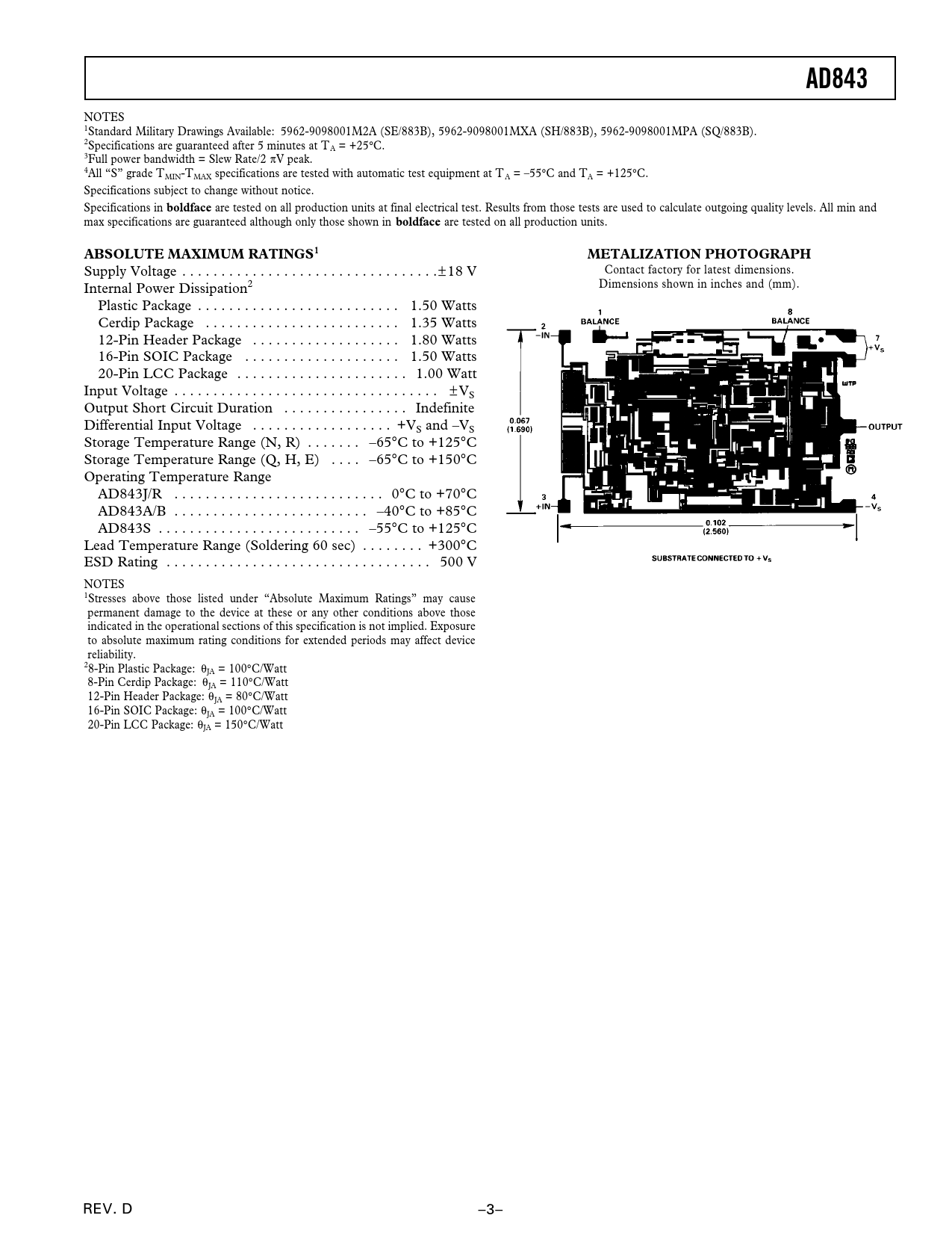 AD843 boldface ABSOLUTE MAXIMUM RATINGS1 METALIZATION PHOTOGRAPH