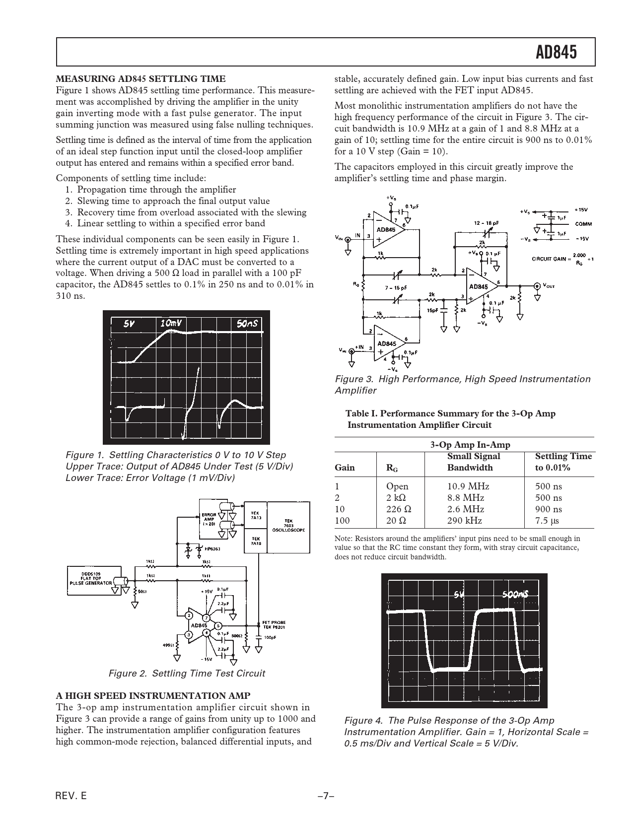 AD845 MEASURING AD845 SETTLING TIME Table I Performance Summary for the 3-Op Amp Instrumentation Amplifier Circuit