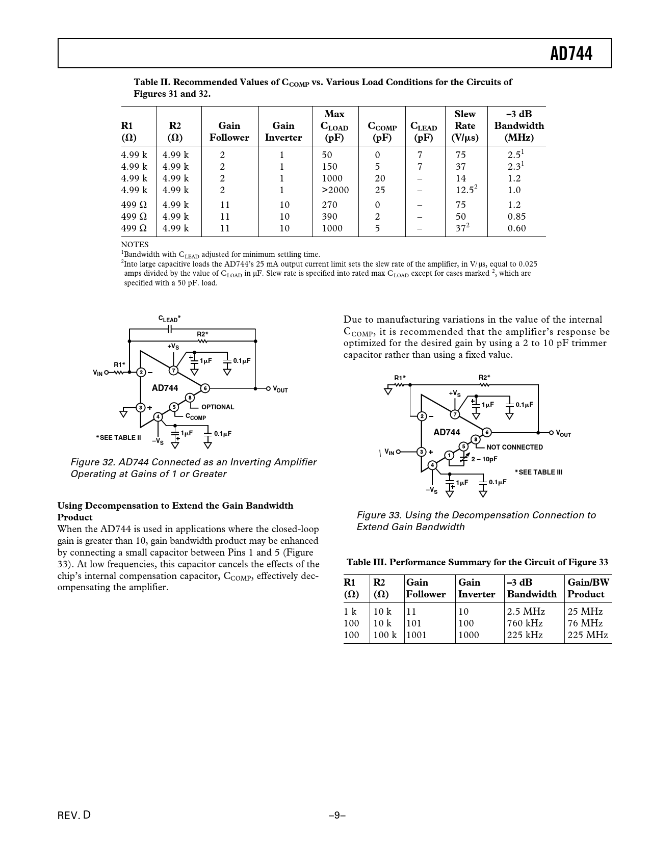 AD744 Table II Recommended Values of CCOMP vs Various Load Conditions for the Circuits of Figures 31 and 32 Max Slew