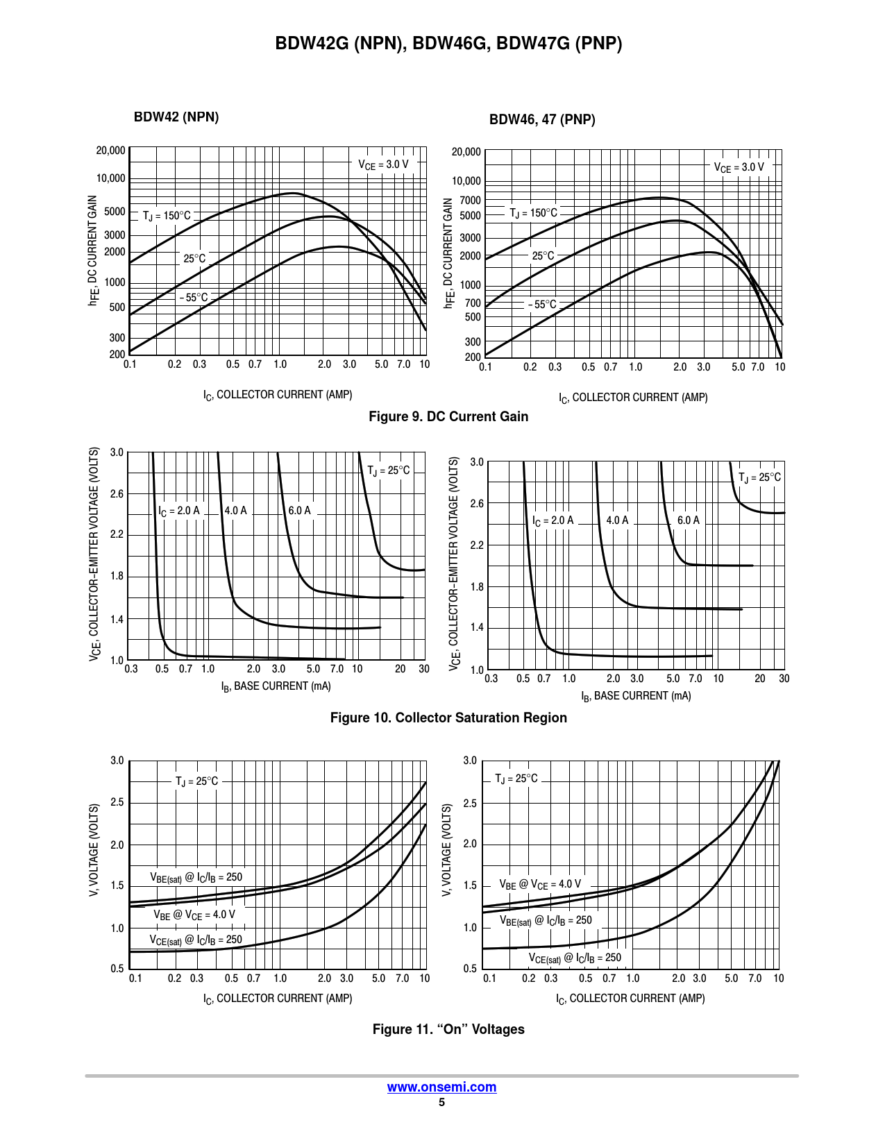 BDW42G (NPN), BDW46G, BDW47G (PNP). BDW42 (NPN). BDW46, 47 (PNP). Figure 9. DC Current Gain