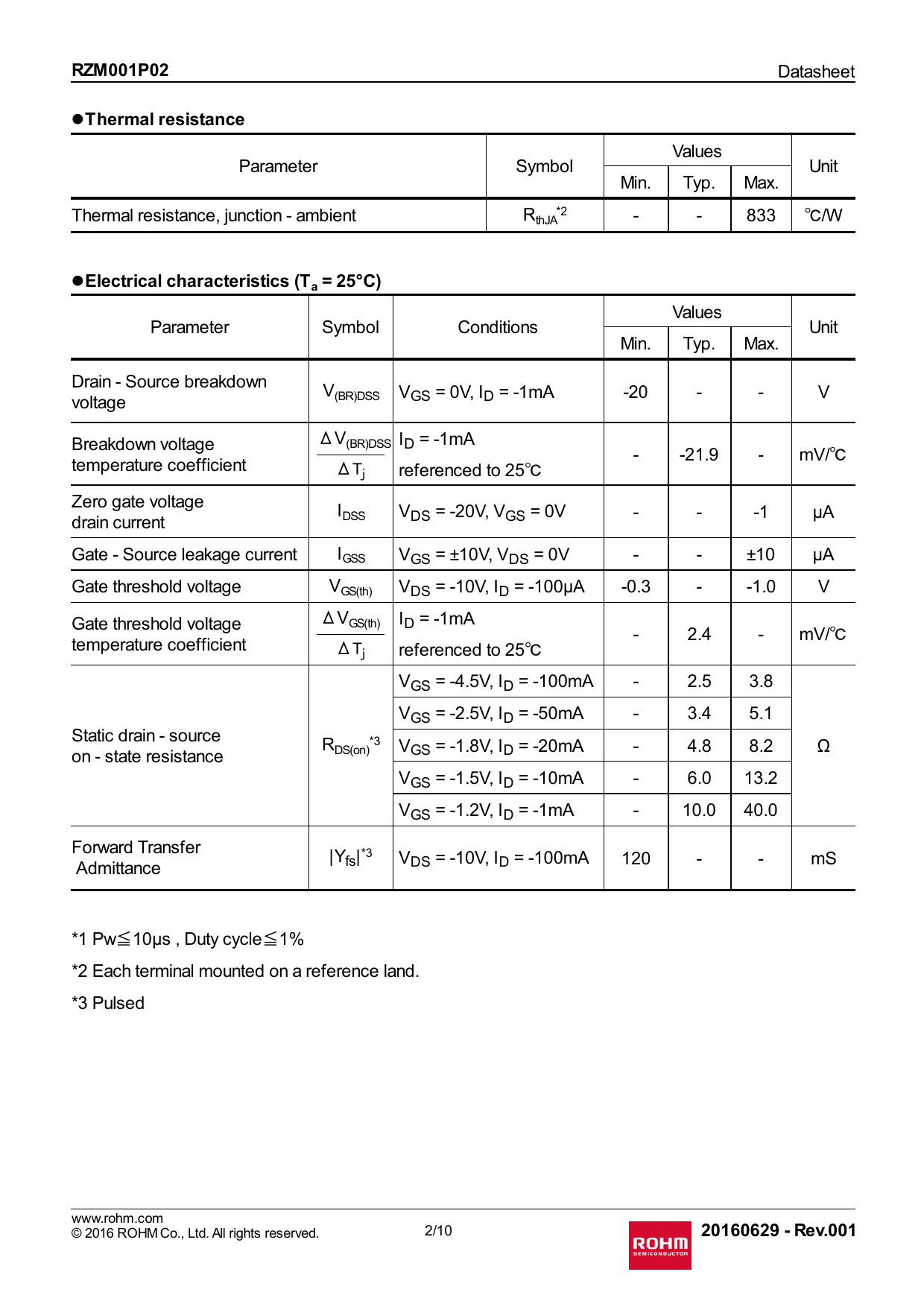 RZM001P02. Thermal resistance. Electrical characteristics (Ta = 25°C). 20160629 - Rev.001