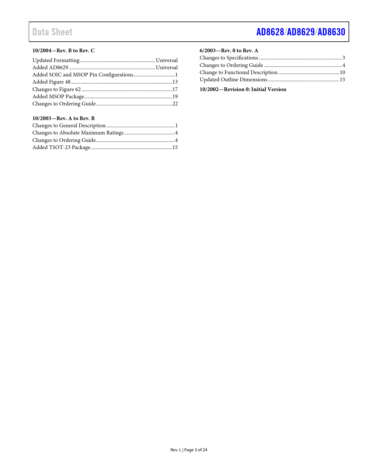 Data Sheet AD8628 /AD8629/ AD8630 10/2004—Rev. B to Rev. C 6/2003—Rev. 0 to Rev. A