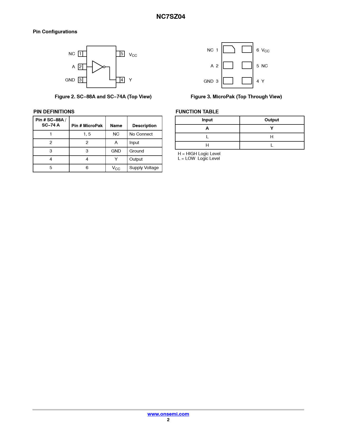 NC7SZ04. Pin Configurations. Figure 2. SC−88A and SC−74A (Top View). Figure 3. MicroPak (Top Through View). PIN DEFINITIONS
