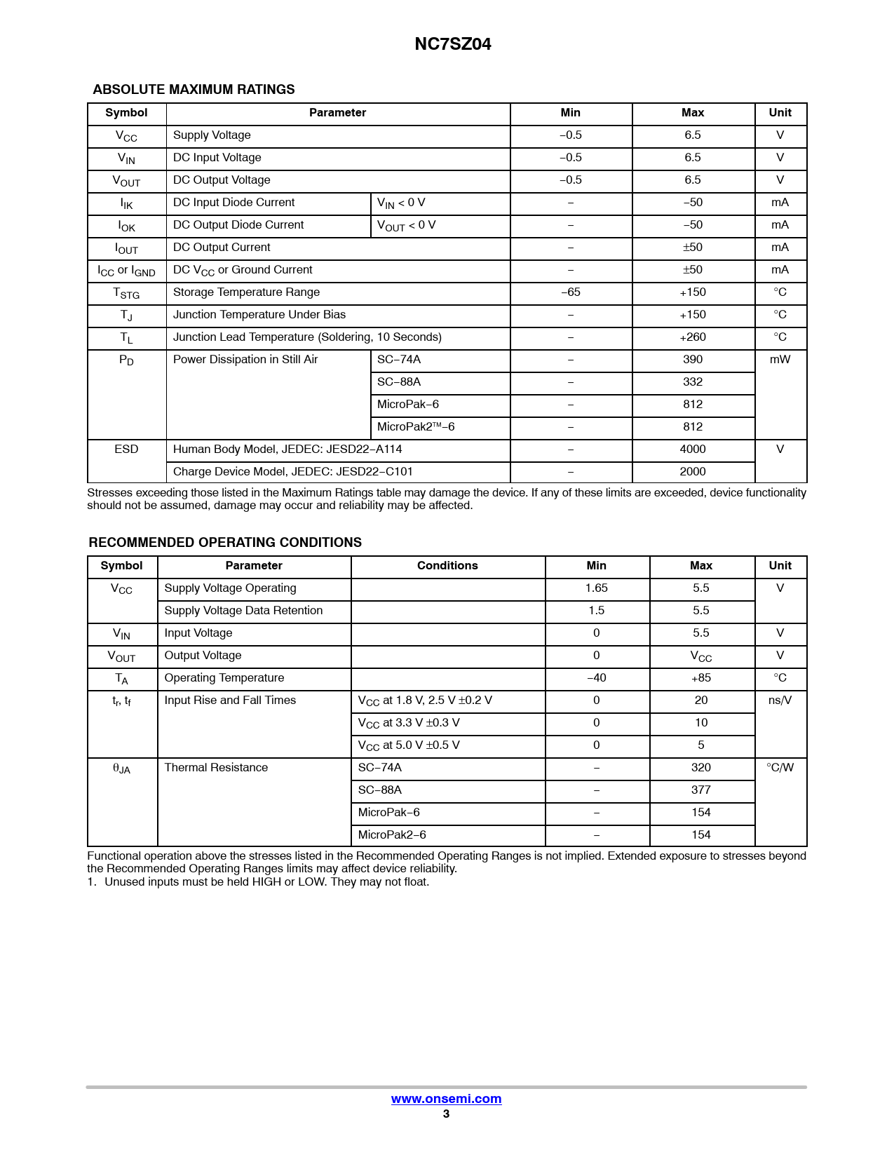NC7SZ04. ABSOLUTE MAXIMUM RATINGS. Symbol. Parameter. Min. Max. Unit. RECOMMENDED OPERATING CONDITIONS. Conditions. www.onsemi.com