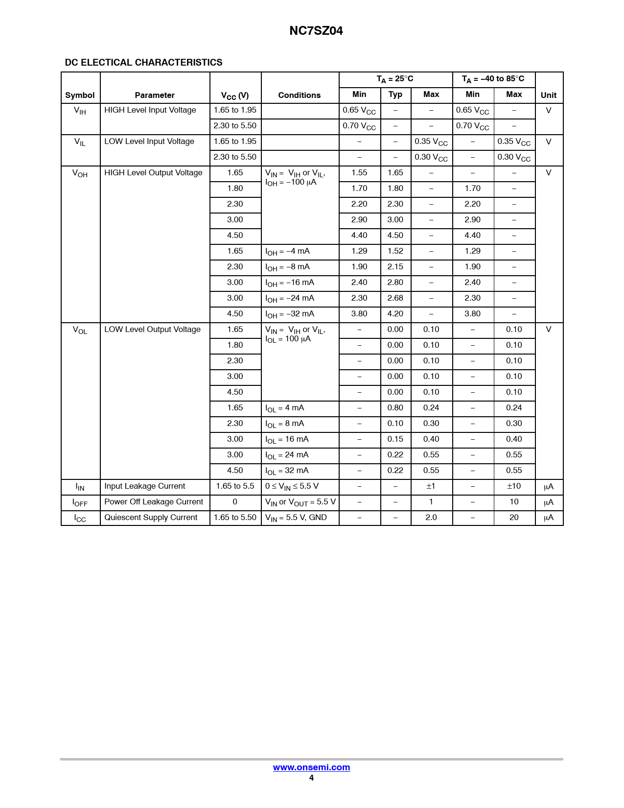 NC7SZ04. DC ELECTICAL CHARACTERISTICS. TA = 25. TA = −40 to 85. Symbol. Parameter. VCC (V). Conditions. Min. Typ. Max. Unit. www.onsemi.com