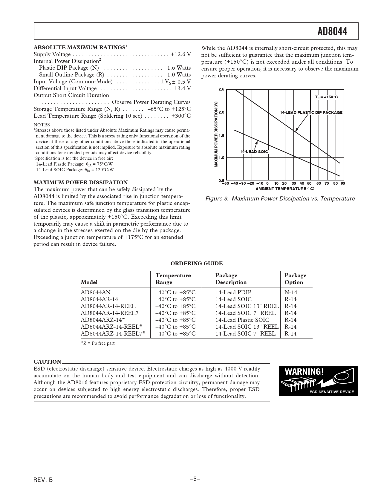 AD8044 ABSOLUTE MAXIMUM RATINGS1 2.5 TJ = +150 C 2.0 14-LEAD PLASTIC DIP PACKAGE 1.5 14-LEAD SOIC 1.0
