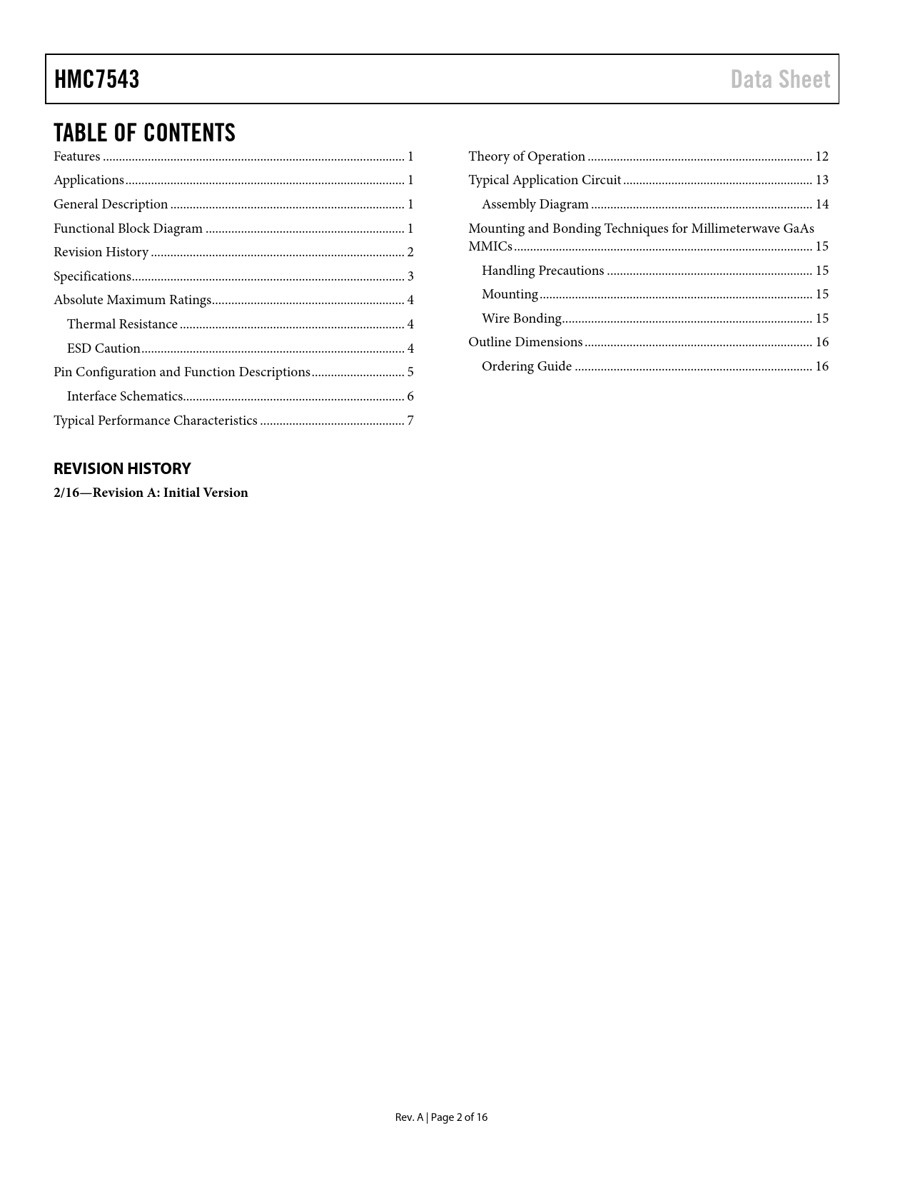 Seiten / Seite16 / 2 — HMC7543. Data Sheet. TABLE OF CONTENTS. REVISION HISTORY 2/16—Revision A: …