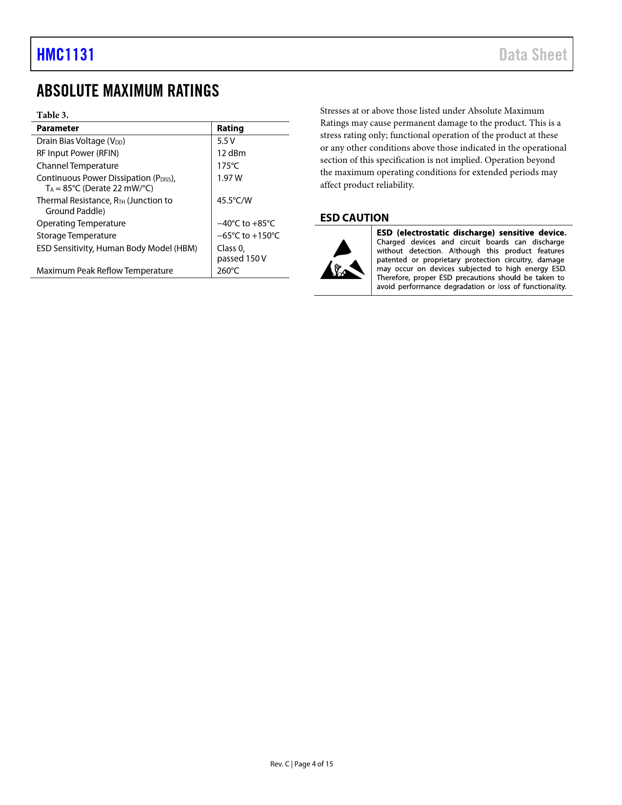 HMC1131Data SheetABSOLUTE MAXIMUM RATINGS Table 3. Stresses at or above those listed under Absolute Maximum ParameterRating Ratings may cause permanent damage to the product. This is a stress rating only; functional operation of the product at these Drain Bias Voltage (VDD) 5.5 V or any other conditions above those indicated in the operational RF Input Power (RFIN) 12 dBm section of this specification is not implied. Operation beyond Channel Temperature 175°C the maximum operating conditions for extended periods may Continuous Power Dissipation (PDISS), 1.97 W T affect product reliability. A = 85°C (Derate 22 mW/°C) Thermal Resistance, RTH (Junction to 45.5°C/W Ground Paddle) ESD CAUTION Operating Temperature −40°C to +85°C Storage Temperature −65°C to +150°C ESD Sensitivity, Human Body Model (HBM) Class 0, passed 150 V Maximum Peak Reflow Temperature 260°C Rev. C | Page 4 of 15 Document Outline FEATURES APPLICATIONS FUNCTIONAL BLOCK DIAGRAM GENERAL DESCRIPTION REVISION HISTORY ELECTRICAL SPECIFICATIONS 24 GHz TO 27 GHz FREQUENCY RANGE 27 GHz TO 35 GHz FREQUENCY RANGE ABSOLUTE MAXIMUM RATINGS ESD CAUTION PIN CONFIGURATION AND FUNCTION DESCRIPTIONS INTERFACE SCHEMATICS TYPICAL PERFORMANCE CHARACTERISTICS APPLICATIONS INFORMATION EVALUATION PCB Bill of Materials TYPICAL APPLICATION CIRCUIT OUTLINE DIMENSIONS ORDERING GUIDE