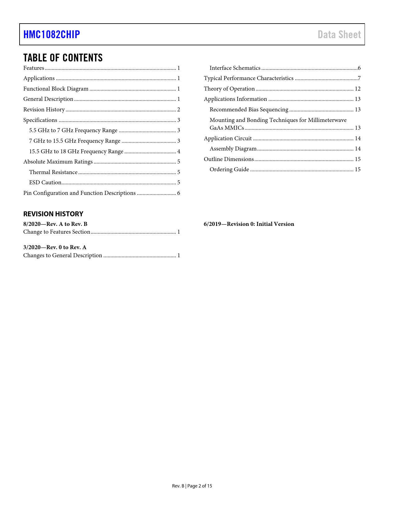 Seiten / Seite15 / 2 — HMC1082CHIP. Data Sheet. TABLE OF CONTENTS. REVISION HISTORY 8/2020—Rev. …