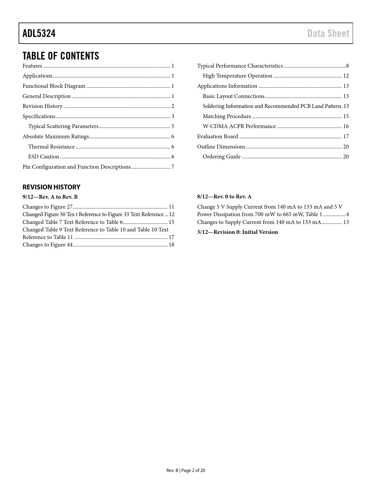 link to page 1 link to page 1 link to page 1 link to page 1 link to page 2 link to page 3 link to page 5 link to page 6 link to page 6 link to page 6 link to page 7 link to page 8 link to page 12 link to page 13 link to page 13 link to page 13 link to page 15 link to page 16 link to page 17 link to page 20 link to page 20 ADL5324Data SheetTABLE OF CONTENTS Features .. 1 Typical Performance Characteristics ..8 Applications ... 1 High Temperature Operation ... 12 Functional Block Diagram .. 1 Applications Information .. 13 General Description ... 1 Basic Layout Connections ... 13 Revision History ... 2 Soldering Information and Recommended PCB Land Pattern. 13 Specifications ... 3 Matching Procedure ... 15 Typical Scattering Parameters ... 5 W-CDMA ACPR Performance .. 16 Absolute Maximum Ratings .. 6 Evaluation Board .. 17 Thermal Resistance .. 6 Outline Dimensions ... 20 ESD Caution .. 6 Ordering Guide .. 20 Pin Configuration and Function Descriptions ... 7 REVISION HISTORY 9/12—Rev. A to Rev. B8/12—Rev. 0 to Rev. A Changes to Figure 27 .. 11 Change 5 V Supply Current from 140 mA to 133 mA and 5 V Changed Figure 30 Tex t Reference to Figure 33 Text Reference . 12 Power Dissipation from 700 mW to 665 mW, Table 1 ... 4 Changed Table 7 Text Reference to Table 6 ... 15 Changes to Supply Current from 140 mA to 133 mA ... 13 Changed Table 9 Text Reference to Table 10 and Table 10 Text 3/12—Revision 0: Initial Version Reference to Table 11 ... 17 Changes to Figure 44 .. 18 Rev. B | Page 2 of 20 Document Outline Features Applications General Description Functional Block Diagram Table of Contents Revision History Specifications Typical Scattering Parameters Absolute Maximum Ratings Thermal Resistance ESD Caution Pin Configuration and Function Descriptions Typical Performance Characteristics High Temperature Operation Applications Information Basic Layout Connections Soldering Information and Recommended PCB Land Pattern Matching Procedure W-CDMA ACPR Performance Evaluation Board Outline Dimensions Ordering Guide
