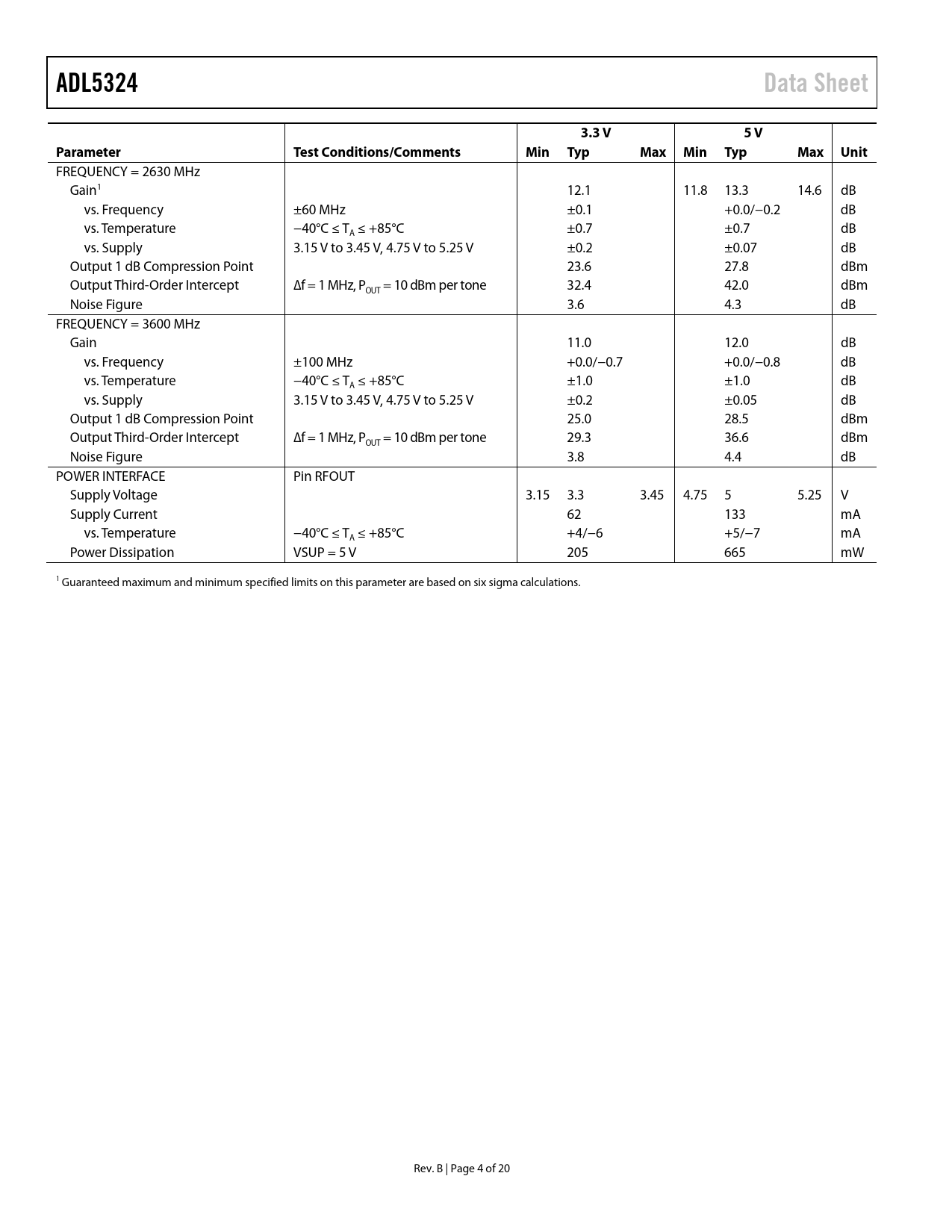 ADL5324. Data Sheet. 3.3 V. 5 V. Parameter. Test Conditions/Comments. Min Typ. Max Min Typ. Max Unit