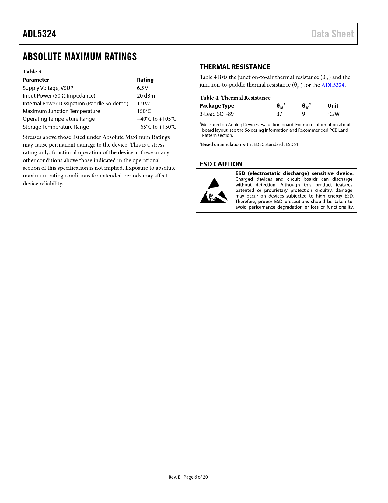 ADL5324 Data Sheet ABSOLUTE MAXIMUM RATINGS THERMAL RESISTANCE Table 3 Parameter Rating Table 4 Thermal Resistance