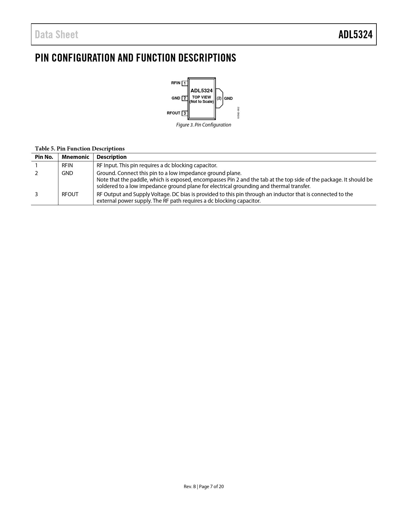 Data SheetADL5324PIN CONFIGURATION AND FUNCTION DESCRIPTIONSRFIN 1ADL5324GND 2TOP VIEW(2) GND(Not to Scale) 002 RFOUT 3 10562- Figure 3. Pin Configuration Table 5. Pin Function Descriptions Pin No.Mnemonic Description 1 RFIN RF Input. This pin requires a dc blocking capacitor. 2 GND Ground. Connect this pin to a low impedance ground plane. Note that the paddle, which is exposed, encompasses Pin 2 and the tab at the top side of the package. It should be soldered to a low impedance ground plane for electrical grounding and thermal transfer. 3 RFOUT RF Output and Supply Voltage. DC bias is provided to this pin through an inductor that is connected to the external power supply. The RF path requires a dc blocking capacitor. Rev. B | Page 7 of 20 Document Outline Features Applications General Description Functional Block Diagram Table of Contents Revision History Specifications Typical Scattering Parameters Absolute Maximum Ratings Thermal Resistance ESD Caution Pin Configuration and Function Descriptions Typical Performance Characteristics High Temperature Operation Applications Information Basic Layout Connections Soldering Information and Recommended PCB Land Pattern Matching Procedure W-CDMA ACPR Performance Evaluation Board Outline Dimensions Ordering Guide
