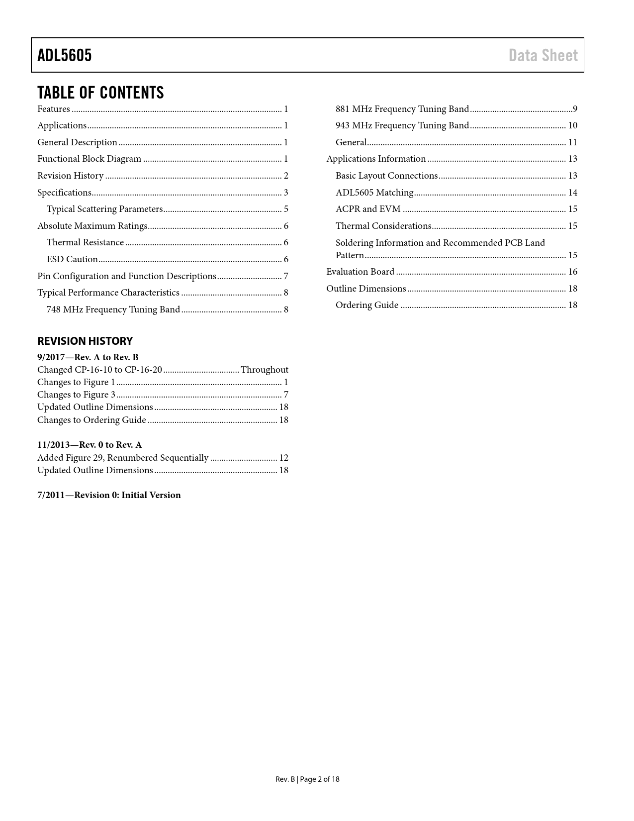 link to page 1 link to page 1 link to page 1 link to page 1 link to page 2 link to page 3 link to page 5 link to page 6 link to page 6 link to page 6 link to page 7 link to page 8 link to page 8 link to page 9 link to page 10 link to page 11 link to page 13 link to page 13 link to page 14 link to page 15 link to page 15 link to page 15 link to page 15 link to page 16 link to page 18 link to page 18 ADL5605Data SheetTABLE OF CONTENTS Features .. 1 881 MHz Frequency Tuning Band ..9 Applications ... 1 943 MHz Frequency Tuning Band ... 10 General Description ... 1 General... 11 Functional Block Diagram .. 1 Applications Information .. 13 Revision History ... 2 Basic Layout Connections ... 13 Specifications ... 3 ADL5605 Matching .. 14 Typical Scattering Parameters ... 5 ACPR and EVM ... 15 Absolute Maximum Ratings .. 6 Thermal Considerations .. 15 Thermal Resistance .. 6 Soldering Information and Recommended PCB Land ESD Caution .. 6 Pattern .. 15 Pin Configuration and Function Descriptions ... 7 Evaluation Board .. 16 Typical Performance Characteristics ... 8 Outline Dimensions ... 18 748 MHz Frequency Tuning Band ... 8 Ordering Guide .. 18 REVISION HISTORY 9/2017—Rev. A to Rev. B Changed CP-16-10 to CP-16-20 .. Throughout Changes to Figure 1 .. 1 Changes to Figure 3 .. 7 Updated Outline Dimensions ... 18 Changes to Ordering Guide .. 18 11/2013—Rev. 0 to Rev. A Added Figure 29, Renumbered Sequentially .. 12 Updated Outline Dimensions ... 18 7/2011—Revision 0: Initial Version Rev. B | Page 2 of 18 Document Outline FEATURES APPLICATIONS GENERAL DESCRIPTION FUNCTIONAL BLOCK DIAGRAM TABLE OF CONTENTS REVISION HISTORY SPECIFICATIONS TYPICAL SCATTERING PARAMETERS ABSOLUTE MAXIMUM RATINGS THERMAL RESISTANCE ESD CAUTION PIN CONFIGURATION AND FUNCTION DESCRIPTIONS TYPICAL PERFORMANCE CHARACTERISTICS 748 MHZ FREQUENCY TUNING BAND 881 MHZ FREQUENCY TUNING BAND 943 MHZ FREQUENCY TUNING BAND GENERAL APPLICATIONS INFORMATION BASIC LAYOUT CONNECTIONS Power Supply RF Input Interface RF Output Interface Power-Down ADL5605 MATCHING ACPR AND EVM THERMAL CONSIDERATIONS SOLDERING INFORMATION AND RECOMMENDED PCB LAND PATTERN EVALUATION BOARD OUTLINE DIMENSIONS ORDERING GUIDE