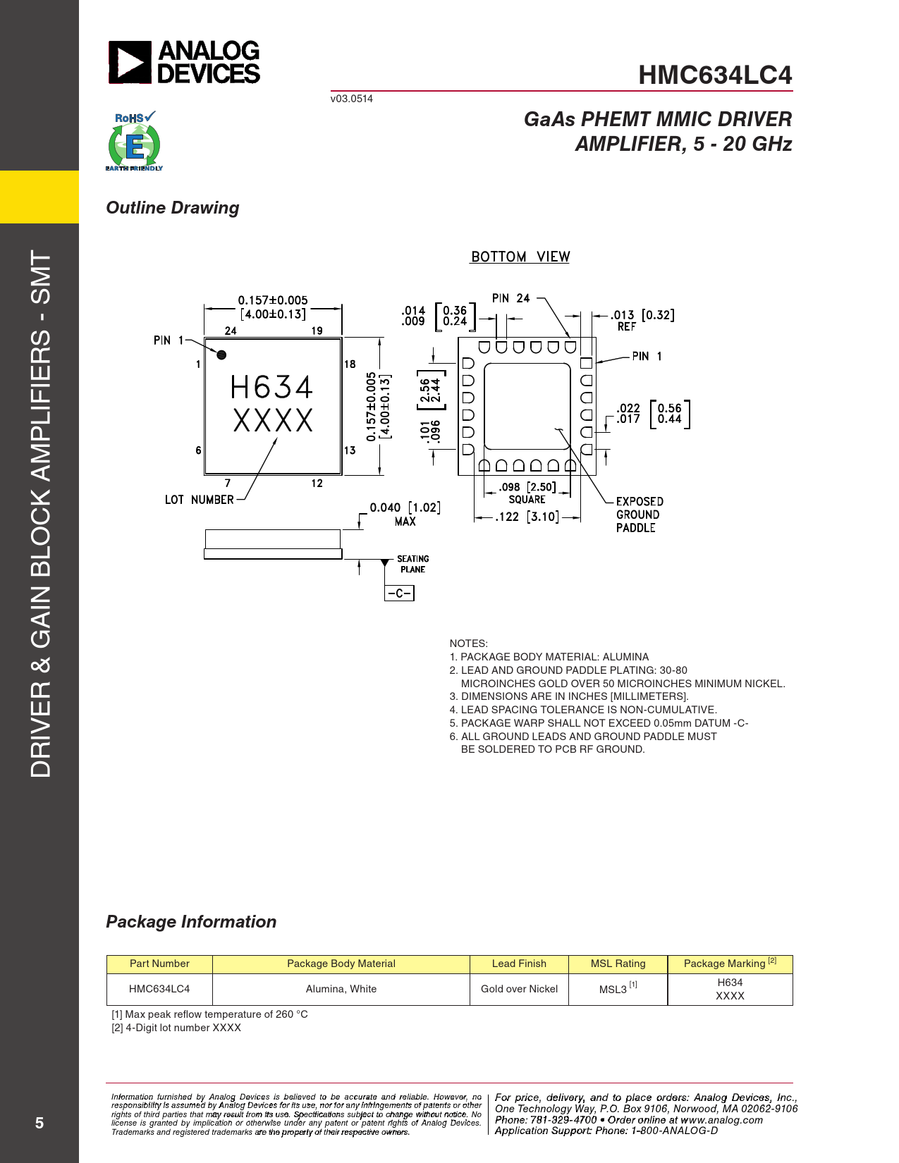 HMC634LC4. GaAs PHEMT MMIC DRIVER. AMPLIFIER, 5 - 20 GHz. Outline Drawing. Package Information