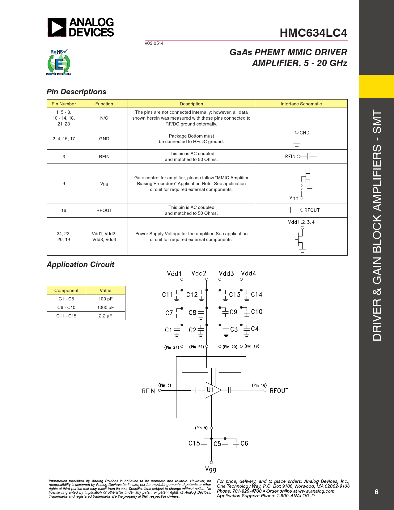 HMC634LC4. GaAs PHEMT MMIC DRIVER. AMPLIFIER, 5 - 20 GHz. Pin Descriptions. Application Circuit