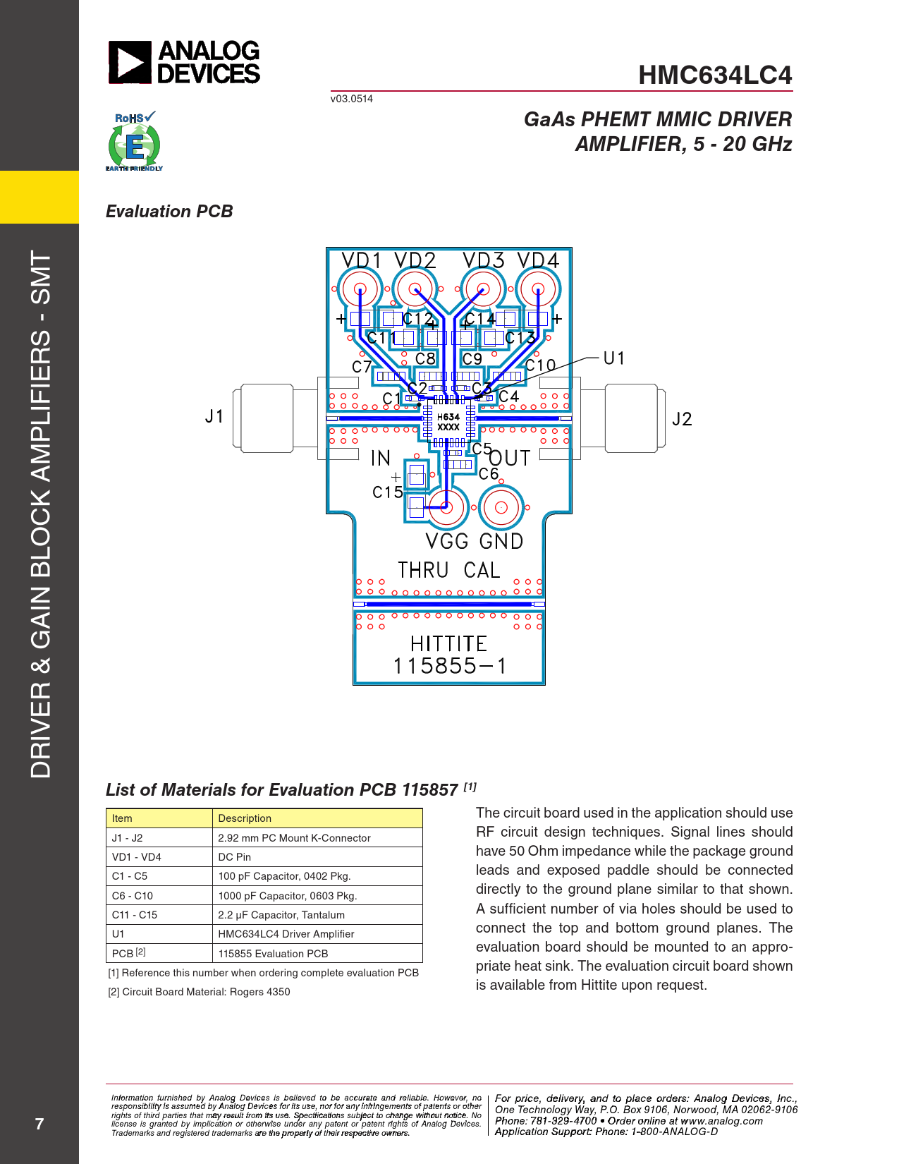 HMC634LC4 GaAs PHEMT MMIC DRIVER AMPLIFIER, 5 - 20 GHz Evaluation PCB List of Materials for Evaluation PCB 115857 [1]
