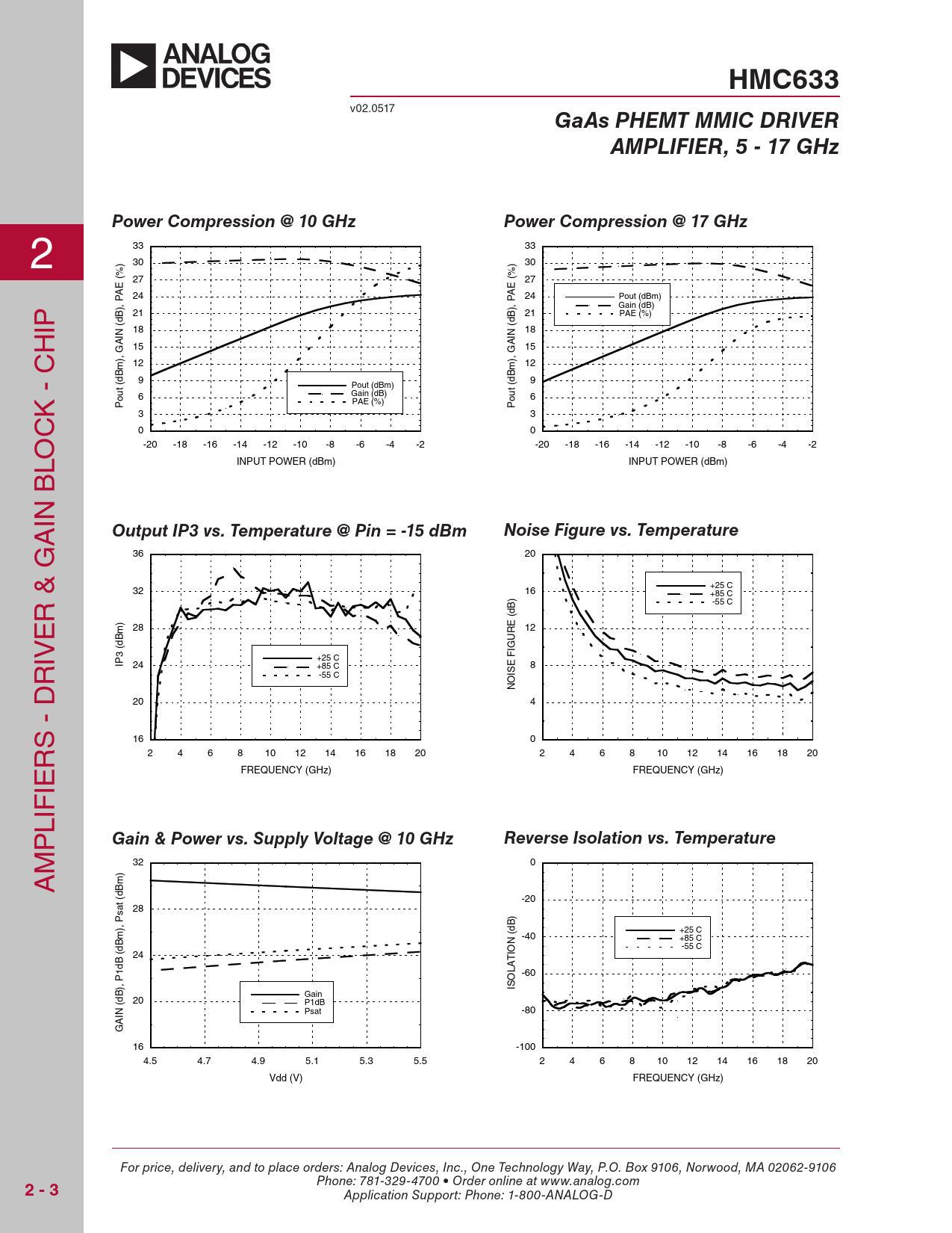 HMC633. GaAs PHEMT MMIC DRIVER. AMPLIFIER, 5 - 17 GHz. Power Compression @ 10 GHz. Power Compression @ 17 GHz