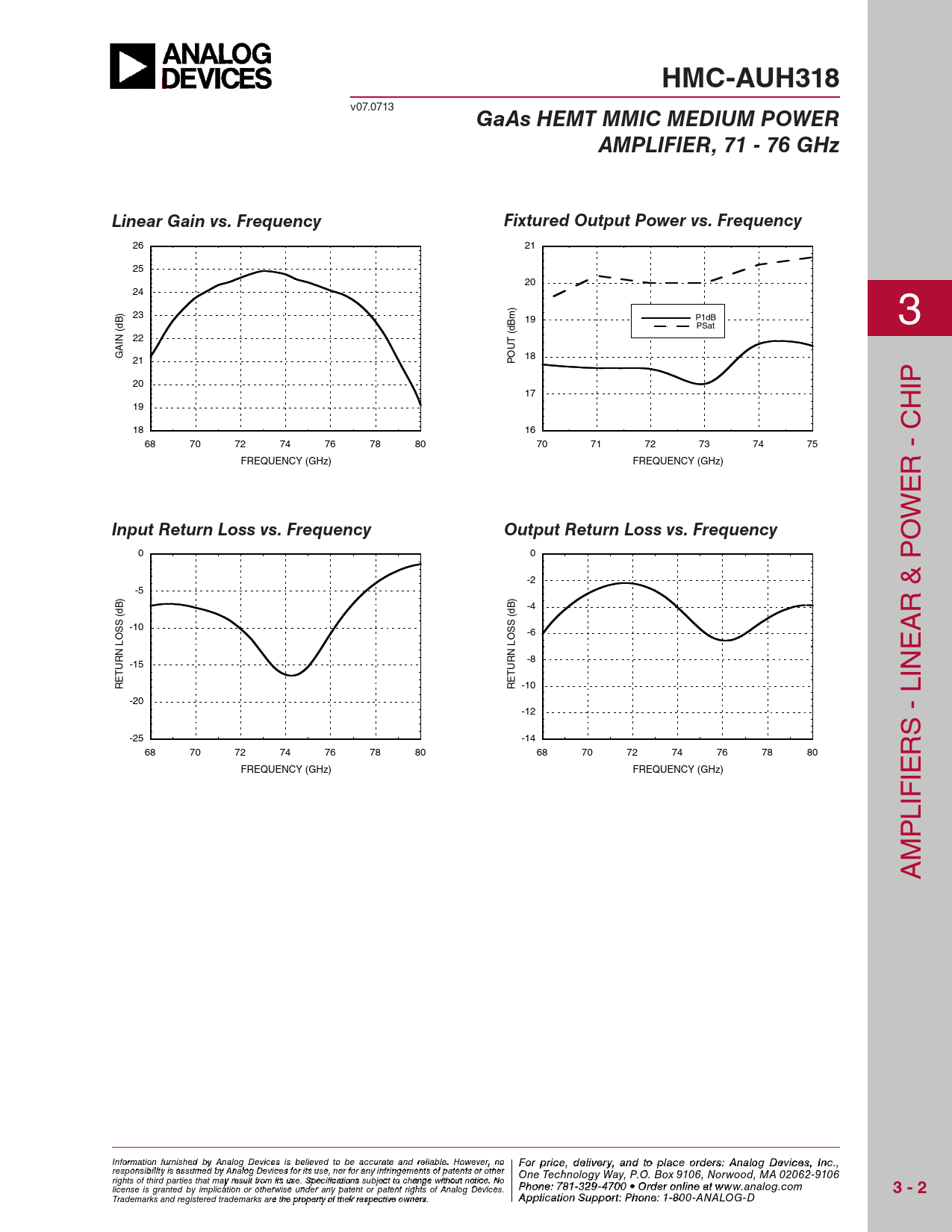 HMC-AUH318 v07.0713 GaAs HEMT MMIC MEDIUM POWERAMPLIFIER, 71 - 76 GHzLinear Gain vs. FrequencyFixtured Output Power vs. Frequency 26 21 25 20 24 23 19 P1dB PSat 3 (dB) (dBm) 22 GAIN 18 21 POUT 20 IP 17 19 H 18 16 68 70 72 74 76 78 80 70 71 72 73 74 75 FREQUENCY (GHz) FREQUENCY (GHz) R - C E W Input Return Loss vs. FrequencyOutput Return Loss vs. Frequency O 0 0 -2 -5 -4 (dB) (dB) R & P -10 -6 A LOSS LOSS E -15 -8 IN RETURN RETURN -10 -20 -12 -25 -14 S - L 68 70 72 74 76 78 80 68 70 72 74 76 78 80 R FREQUENCY (GHz) FREQUENCY (GHz) IE LIF P M A Inf F or o m r p atio r n ifc ur e n , d ishe e d lbiv y e A r n y a alog n D d t evic o p es is la beclie o eved rd to ebre sa: H ccur iattti e tae M nd re ilicarbloew . H a o ve C wever, o n rp o For price, delivery, and to place orders: Analog Devices, Inc., responsibility is assumed by Analog Devices for its use, nor for any infringements of patents or other oration, 2 Elizabeth Drive, Chelmsford, MA 01824 One Technology Way, P.O. Box 9106, Norwood, MA 02062-9106 Phone: 978-250-3343 Fax: 978-250-3373 O rights of third parties that may result from its use. Specifications subject to change without notice. No P rd hone e r O : 7 n 81- -3li 2n 9 e a -47 t w 0 w 0 • O w rd .h e it r o t niltie n .c e ao t m license is granted by implication or otherwise under any patent or patent rights of Analog Devices. www.analog.com 3 - 2 Application Support: Pho Trademarks and registered trademarks are the property of their respective owners. ne: 978-250-33 A 4 p 3 p o lica rti a o p n S p u s p @ po h rt itt : P ite ho . n c e om : 1-800-ANALOG-D