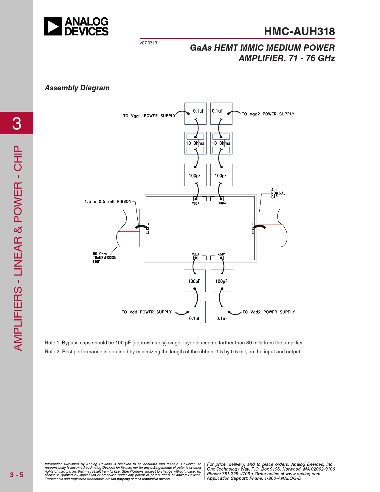 HMC-AUH318 v07.0713 GaAs HEMT MMIC MEDIUM POWERAMPLIFIER, 71 - 76 GHzAssembly Diagram 3 IP H R - C E W O R & P A E IN S - L R IE LIF P M A Note 1: Bypass caps should be 100 pF (approximately) single-layer placed no farther than 30 mils from the amplifier. Note 2: Best performance is obtained by minimizing the length of the ribbon, 1.5 by 0.5 mil, on the input and output. Inf F or o m r p ation rfic ur e nis, d he e d lbiy ve An ry a alog n Ded t vice o p s is la belciee o ved rd to e b r e sa: H ccur iattte itae M nd reliic a r bl o e. w H a o v we e C ver, noo For price, delivery, and to place orders: Analog Devices, Inc., responsibility is assumed by Analog Devices for its use, nor for any infringements of patents or other rporation, 2 Elizabeth Drive, Chelmsford, MA 01824 One Technology Way, P.O. Box 9106, Norwood, MA 02062-9106 3 - 5 Phone: 978-250-3343 Fax: 978-250-3373 O rights of third parties that may result from its use. Specifications subject to change without notice. No Ph rd on e e r O : 7 n 81- - 3 li 2 n 9-e a 470 t ww 0 • O w rd . e hi r ott nliite n .c e a o t m license is granted by implication or otherwise under any patent or patent rights of Analog Devices. www.analog.com Application Support: Pho Trademarks and registered trademarks are the property of their respective owners. ne: 978-250-33 A 4 p 3 pli o cat ri a o p n S p ups@ por h t it : Ptit hoen.c e om : 1-800-ANALOG-D