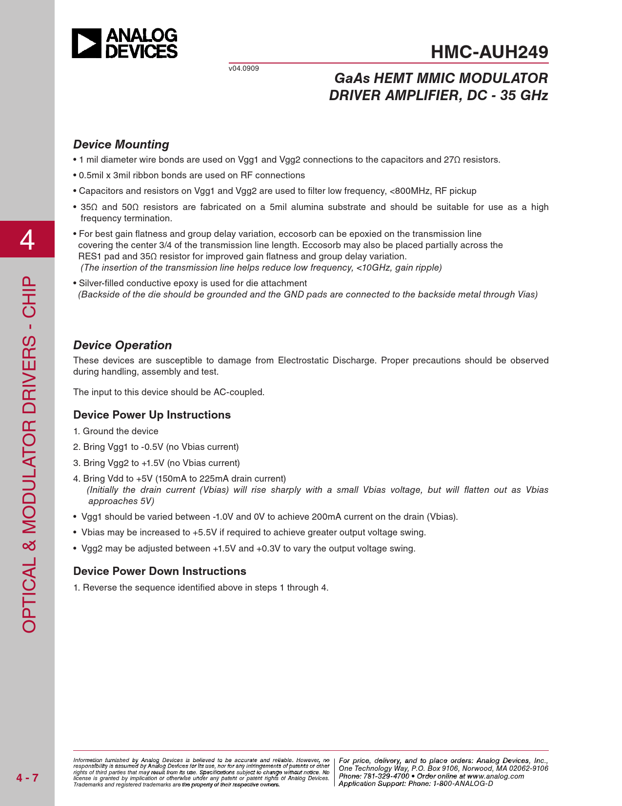 HMC-AUH249 GaAs HEMT MMIC MODULATOR DRIVER AMPLIFIER, DC - 35 GHz Device Mounting Device Operation