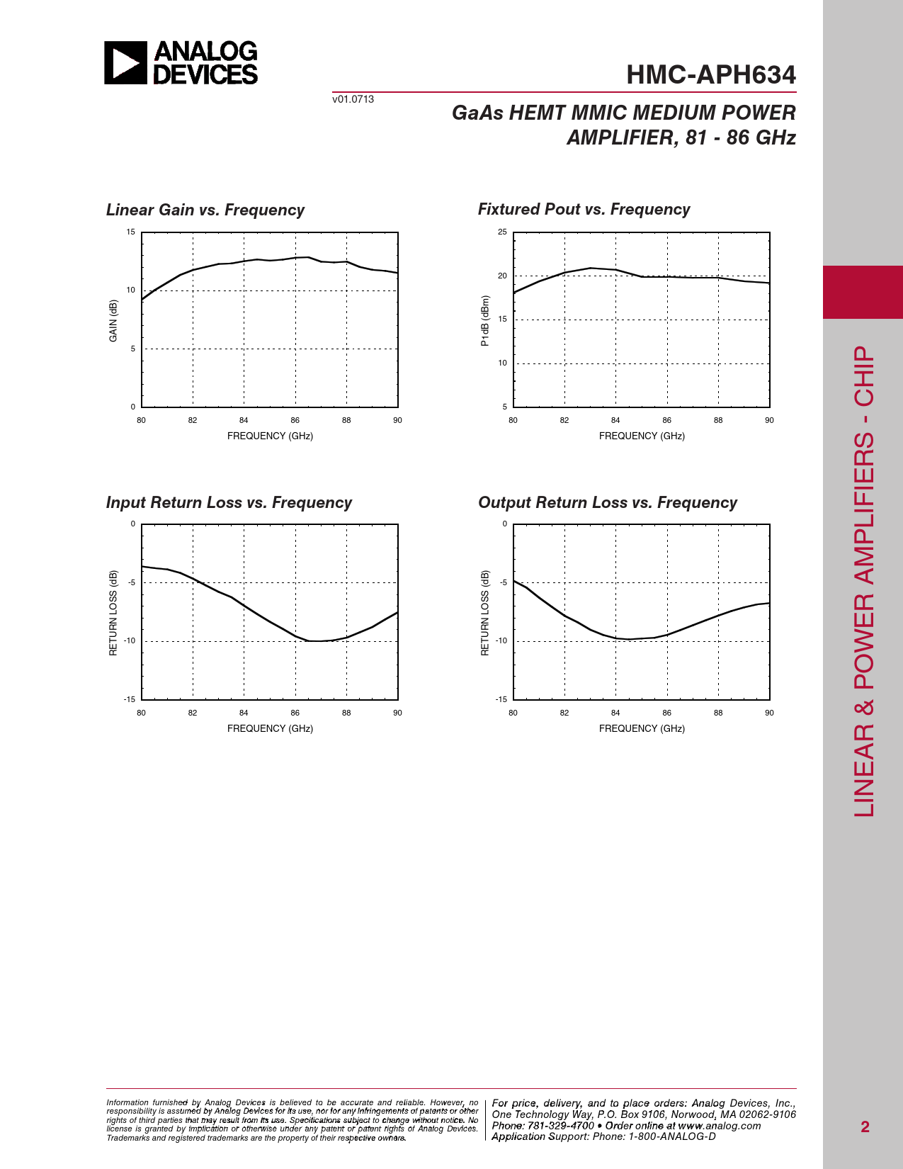 HMC-APH634 v01.0713 GaAs HEMT MMIC MEDIUM POWERAMPLIFIER, 81 - 86 GHzLinear Gain vs. FrequencyFixtured Pout vs. Frequency 15 25 20 10 (dB) (dBm) 15 GAIN P1dB 5 10 IP H 0 5 80 82 84 86 88 90 80 82 84 86 88 90 FREQUENCY (GHz) FREQUENCY (GHz) S - C R IE Input Return Loss vs. FrequencyOutput Return Loss vs. Frequency 0 0 LIF P M -5 -5 (dB) (dB) LOSS LOSS R A E -10 -10 RETURN RETURN W O -15 -15 80 82 84 86 88 90 80 82 84 86 88 90 FREQUENCY (GHz) FREQUENCY (GHz) R & P A E LIN Information furnish F e o d r p by A rnic alo e g , d Devi ecleis vie s rby eli, a eve nd t d to b o p e a l cc a ur c at e o e an r d d releiars ble , p . Ho le we a ve sr, e c no For price, delivery, and to place orders: Analog Devices, Inc., responsibility is assumed by Analog Devices for its use, nor for any infringements of patents or other ontact Hittite Microwave Corporation: One Technology Way, P.O. Box 9106, Norwood, MA 02062-9106 2 Elizabeth Drive, Chelmsford, MA 01824 Phon rights of third parties that may result from its use. Specifications subject to change without notice. No e: 9 Ph 7 o 8 ne -2 : 7 50 81- - 3 3 2 3 9- 4 4 3 F 70 a 0 • Ox: 9 rde 7 r o 8 nli-2 n 5 e a0 t -33 ww 7 w. 3 license is granted by implication or otherwise under any patent or patent rights of Analog Devices. analog.com 2 Order On- Trademarks and registered trademarks are the property of their respective owners. line at www.hi A tptiptliec.actio o m n Support: Phone: 1-800-ANALOG-D