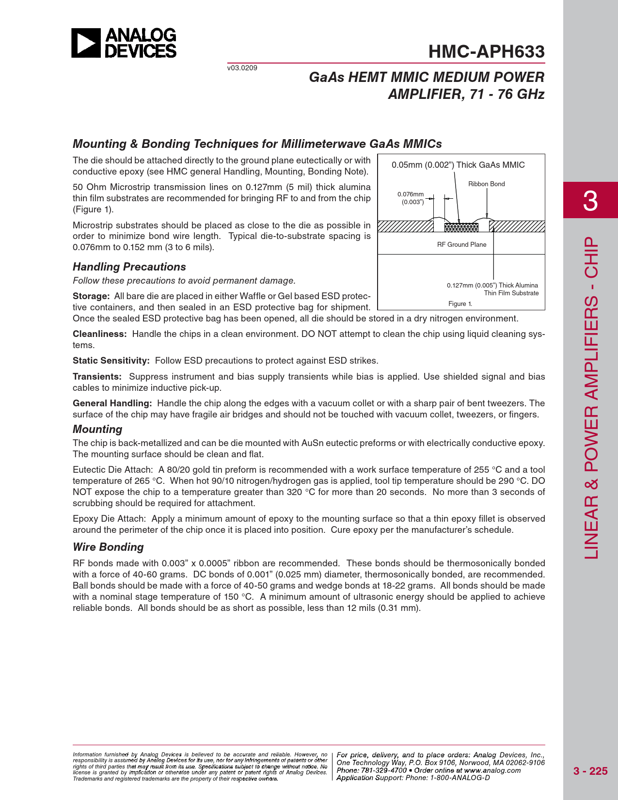 HMC-APH633 v03.0209 GaAs HEMT MMIC MEDIUM POWERAMPLIFIER, 71 - 76 GHzMounting & Bonding Techniques for Millimeterwave GaAs MMICs The die should be attached directly to the ground plane eutectically or with 0.05mm (0.002”) Thick GaAs MMIC conductive epoxy (see HMC general Handling, Mounting, Bonding Note). 50 Ohm Microstrip transmission lines on 0.127mm (5 mil) thick alumina Ribbon Bond 0.076mm thin fi lm substrates are recommended for bringing RF to and from the chip (0.003”) (Figure 1). 3 Microstrip substrates should be placed as close to the die as possible in order to minimize bond wire length. Typical die-to-substrate spacing is 0.076mm to 0.152 mm (3 to 6 mils). RF Ground Plane IP H Handling Precautions Follow these precautions to avoid permanent damage. 0.127mm (0.005”) Thick Alumina Storage: All bare die are placed in either Waffle or Gel based ESD protec- Thin Film Substrate tive containers, and then sealed in an ESD protective bag for shipment. Figure 1. S - C Once the sealed ESD protective bag has been opened, all die should be stored in a dry nitrogen environment. R Cleanliness: Handle the chips in a clean environment. DO NOT attempt to clean the chip using liquid cleaning sys- IE tems. IF Static Sensitivity: Follow ESD precautions to protect against ESD strikes. L P Transients: Suppress instrument and bias supply transients while bias is applied. Use shielded signal and bias cables to minimize inductive pick-up. M General Handling: Handle the chip along the edges with a vacuum collet or with a sharp pair of bent tweezers. The surface of the chip may have fragile air bridges and should not be touched with vacuum collet, tweezers, or fi ngers. R A E Mounting The chip is back-metallized and can be die mounted with AuSn eutectic preforms or with electrically conductive epoxy. W The mounting surface should be clean and fl at. O Eutectic Die Attach: A 80/20 gold tin preform is recommended with a work surface temperature of 255 °C and a tool temperature of 265 °C. When hot 90/10 nitrogen/hydrogen gas is applied, tool tip temperature should be 290 °C. DO NOT expose the chip to a temperature greater than 320 °C for more than 20 seconds. No more than 3 seconds of scrubbing should be required for attachment. R & P Epoxy Die Attach: Apply a minimum amount of epoxy to the mounting surface so that a thin epoxy fi llet is observed A around the perimeter of the chip once it is placed into position. Cure epoxy per the manufacturer’s schedule. E Wire Bonding IN L RF bonds made with 0.003” x 0.0005” ribbon are recommended. These bonds should be thermosonically bonded with a force of 40-60 grams. DC bonds of 0.001” (0.025 mm) diameter, thermosonically bonded, are recommended. Ball bonds should be made with a force of 40-50 grams and wedge bonds at 18-22 grams. All bonds should be made with a nominal stage temperature of 150 °C. A minimum amount of ultrasonic energy should be applied to achieve reliable bonds. All bonds should be as short as possible, less than 12 mils (0.31 mm). Information furnish F e o d r pri by An ce, de alog Devic leis vie s rby eli, a eve nd to pla d to be accur ce o ate an r d der relia s ble , pl . Ho ease co wever, no For price, delivery, and to place orders: Analog Devices, Inc., responsibility is assumed by Analog Devices for its use, nor for any infringements of patents or other ntact Hittite Microwave Corporation: One Technology Way, P.O. Box 9106, Norwood, MA 02062-9106 20 Alpha Road, Chelmsford, MA 01824 Phone rights of third parties that may result from its use. Specifications subject to change without notice. No : 978 Phon -e25 : 7 0 81 - - 3 3 3 29 4 - 3 F 470 ax 0 • O : 978 rder o - nl 25 in 0 e a - t 33 ww 73 license is granted by implication or otherwise under any patent or patent rights of Analog Devices. w.analog.com 3 - 225 Order On- Trademarks and registered trademarks are the property of their respective owners. line at www.hi A tptipte.co licatio m n Support: Phone: 1-800-ANALOG-D
