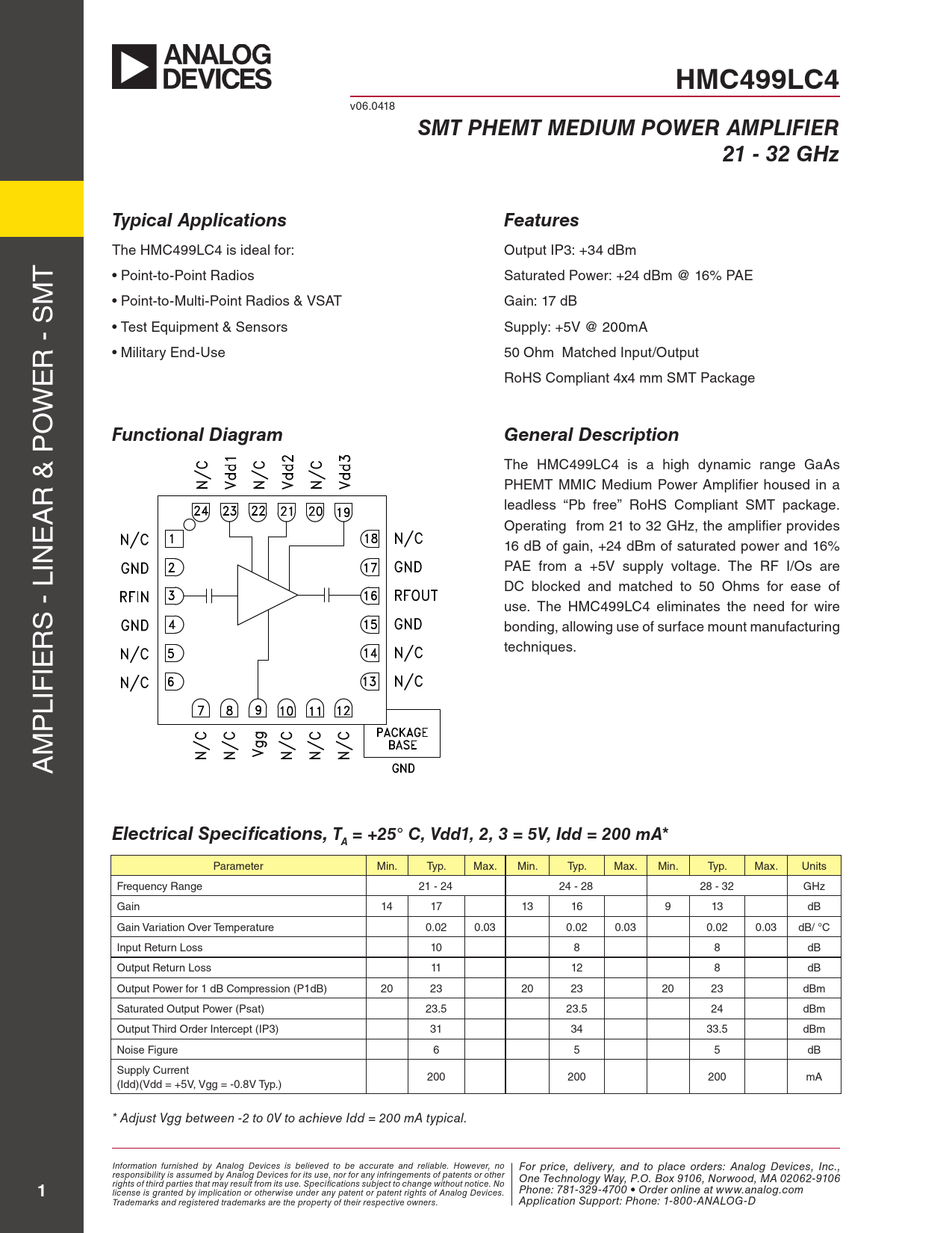 HMC499LC4. SMT PHEMT MEDIUM POWER AMPLIFIER. 21 - 32 GHz. Typical Applications. Features. Functional Diagram. General Description