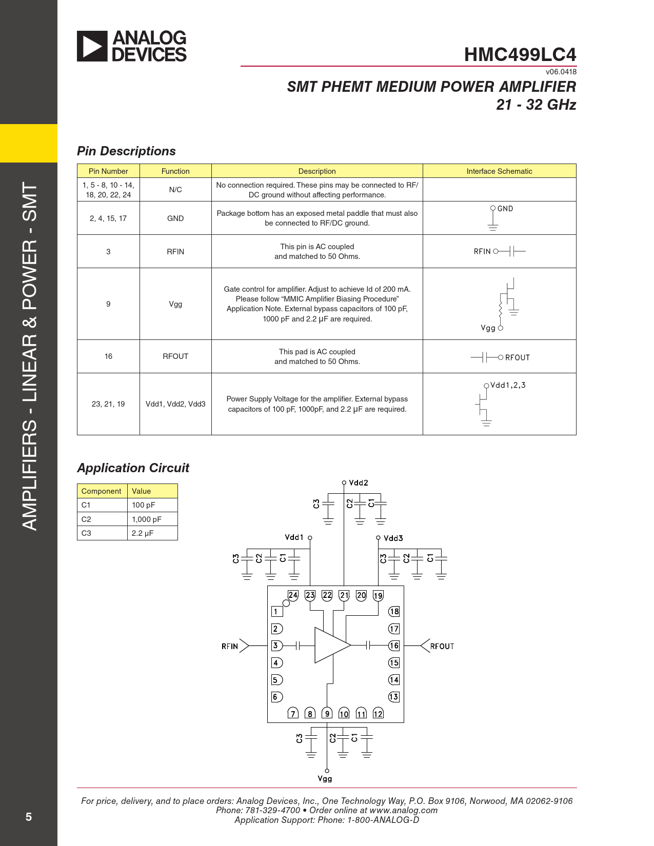 HMC499LC4. SMT PHEMT MEDIUM POWER AMPLIFIER. 21 - 32 GHz. Pin Descriptions. Application Circuit