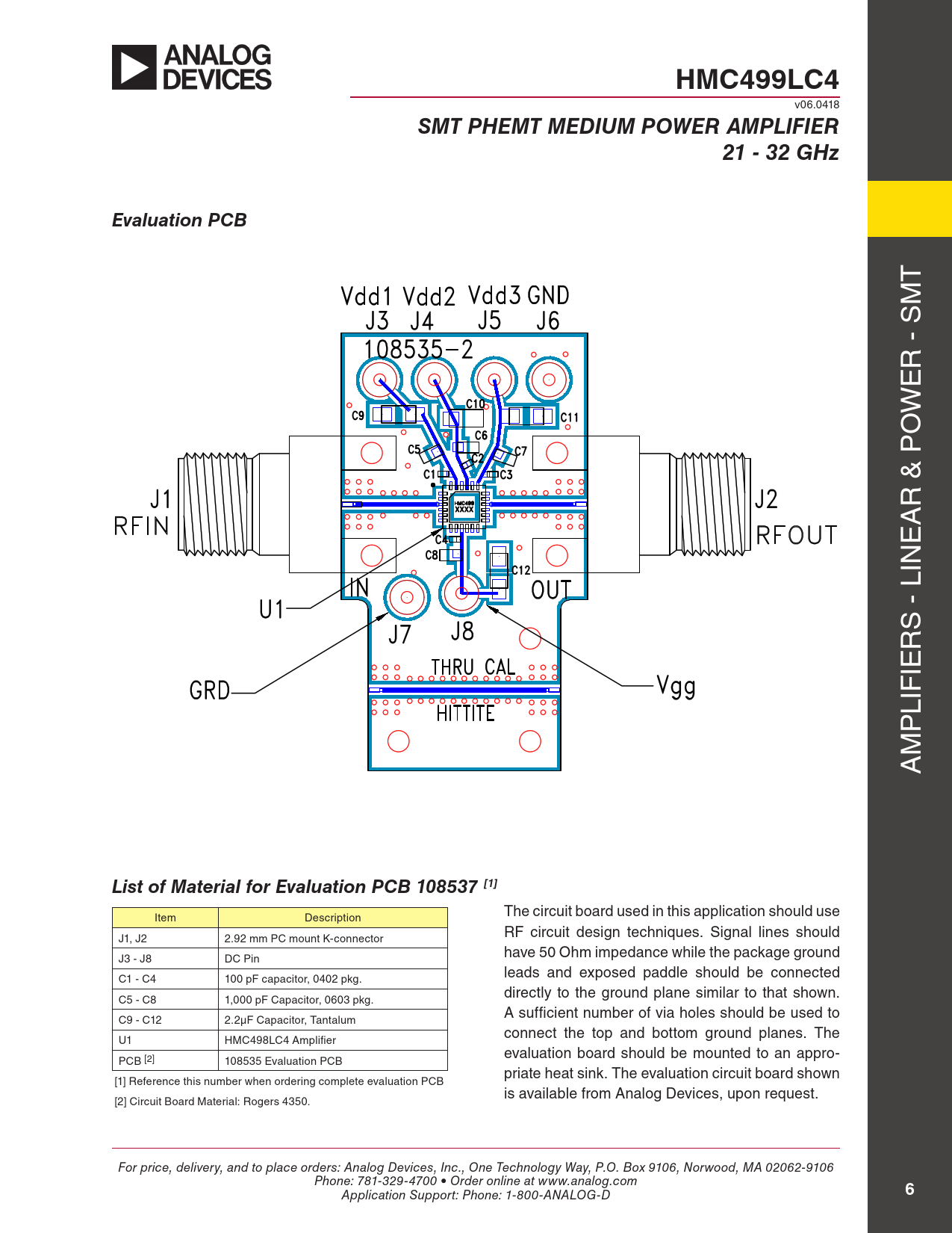 HMC499LC4 v06.0418 SMT PHEMT MEDIUM POWER AMPLIFIER21 - 32 GHzEvaluation PCB T m s r - e w o p r & A e lin s - r ie lif p m A List of Material for Evaluation PCB 108537 [1] The circuit board used in this application should use item Description rf circuit design techniques. signal lines should J1, J2 2.92 mm pC mount K-connector have 50 ohm impedance while the package ground J3 - J8 DC pin leads and exposed paddle should be connected C1 - C4 100 pf capacitor, 0402 pkg. directly to the ground plane similar to that shown. C5 - C8 1,000 pf Capacitor, 0603 pkg. A sufficient number of via holes should be used to C9 - C12 2.2µf Capacitor, Tantalum connect the top and bottom ground planes. The U1 HmC498lC4 Amplifier evaluation board should be mounted to an appro- pCB [2] 108535 evaluation pCB priate heat sink. The evaluation circuit board shown [1] reference this number when ordering complete evaluation pCB is available from Analog Devices, upon request. [2] Circuit Board material: rogers 4350. For price, delivery, and to place orders: Analog Devices, Inc., One Technology Way, P.O. Box 9106, Norwood, MA 02062-9106 Phone: 781-329-4700 • Order online at www.analog.com Application Support: Phone: 1-800-ANALOG-D 6 Document Outline Typical Applications Features Functional Diagram General Description Electrical Specifications Performance Characteristics Broadband Gain & Return Loss Gain vs. Temperature Input Return Loss vs. Temperature Output Return Loss vs. Temperature P1dB vs. Temperature Psat vs. Temperature Output IP3 vs. Temperature Noise Figure vs. Temperature Gain, Power & Output IP3 vs. Supply Voltage @ 22 GHz Reverse Isolation vs. Temperature Power Compression @ 22 GHz Power Compression @ 30 GHz Absolute Maximum Ratings Typical Supply Current vs. Vdd Outline Drawing Pin Descriptions Application Circuit Evaluation PCB List of Material for Evaluation PCB