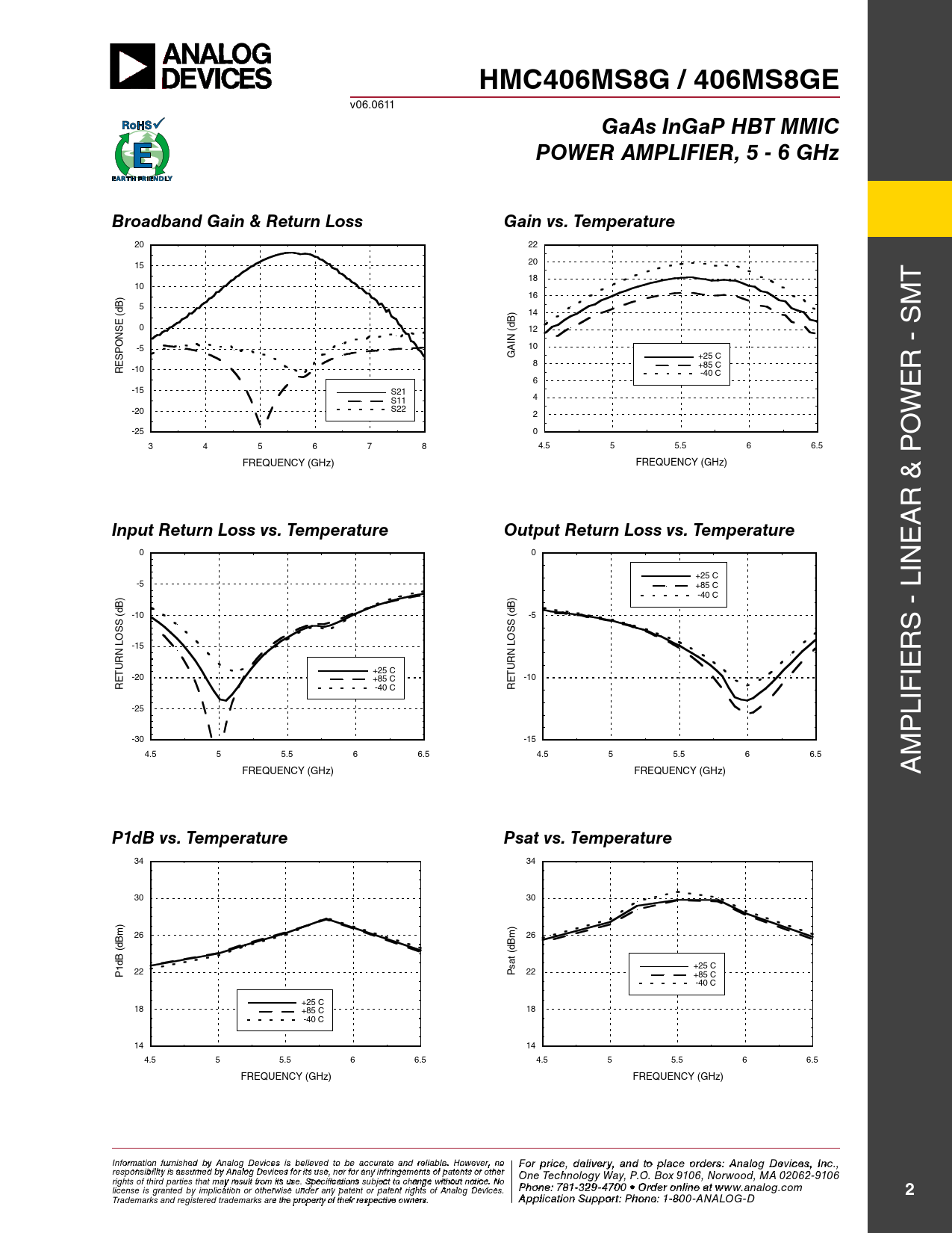 HMC406MS8G / 406MS8GE v06.0611 GaAs InGaP HBT MMICPOWER AMPLIFIER, 5 - 6 GHzBroadband Gain & Return LossGain vs. Temperature 20 22 15 20 18 T 10 16 5 m (dB) 14 s 0 (dB) 12 -5 10 GAIN +25 C 8 +85 C RESPONSE -10 r - -40 C 6 -15 e S21 S11 4 -20 S22 2 w -25 0 o 3 4 5 6 7 8 4.5 5 5.5 6 6.5 p FREQUENCY (GHz) FREQUENCY (GHz) r & A Input Return Loss vs. TemperatureOutput Return Loss vs. Temperature e 0 0 +25 C -5 +85 C lin -40 C (dB) -10 (dB) -5 s - LOSS LOSS -15 r +25 C -20 +85 C -10 ie RETURN -40 C RETURN -25 lif p -30 -15 4.5 5 5.5 6 6.5 4.5 5 5.5 6 6.5 m FREQUENCY (GHz) FREQUENCY (GHz) A P1dB vs. TemperaturePsat vs. Temperature 34 34 30 30 26 26 (dBm) (dBm) +25 C 22 P1dB Psat 22 +85 C -40 C +25 C 18 18 +85 C -40 C 14 14 4.5 5 5.5 6 6.5 4.5 5 5.5 6 6.5 FREQUENCY (GHz) FREQUENCY (GHz) Inf F or o m r p atio r n ifc ur e n , d ishe e d lbiv y e A r n y a alog n D d t evic o p es is la beclie o eved rd to ebre sa: H ccur iattti e tae M nd re ilicarbloew . H a o ve C wever, o n rp o For price, delivery, and to place orders: Analog Devices, Inc., responsibility is assumed by Analog Devices for its use, nor for any infringements of patents or other oration, 2 Elizabeth Drive, Chelmsford, MA 01824 One Technology Way, P.O. Box 9106, Norwood, MA 02062-9106 Phone: 978-250-3343 Fax: 978-250-3373 O rights of third parties that may result from its use. Specifications subject to change without notice. No P rd ho e ne r O : 7 n 81- -3li 2n 9 e a -47 t w 0 w 0 • O w rd .h e it r o tniltie n .c e ao t m license is granted by implication or otherwise under any patent or patent rights of Analog Devices. www.analog.com 2 Application Support: Pho Trademarks and registered trademarks are the property of their respective owners. ne: 978-250-33 A 4 p 3 o plica r a tio p n S p u s p @ po h rt itt : P ite ho . n c e o : 1m -800-ANALOG-D