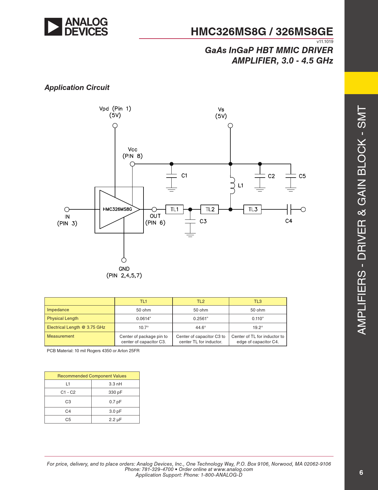 HMC326MS8G / 326MS8GE. GaAs InGaP HBT MMIC DRIVER. AMPLIFIER, 3.0 - 4.5 GHz. Application Circuit