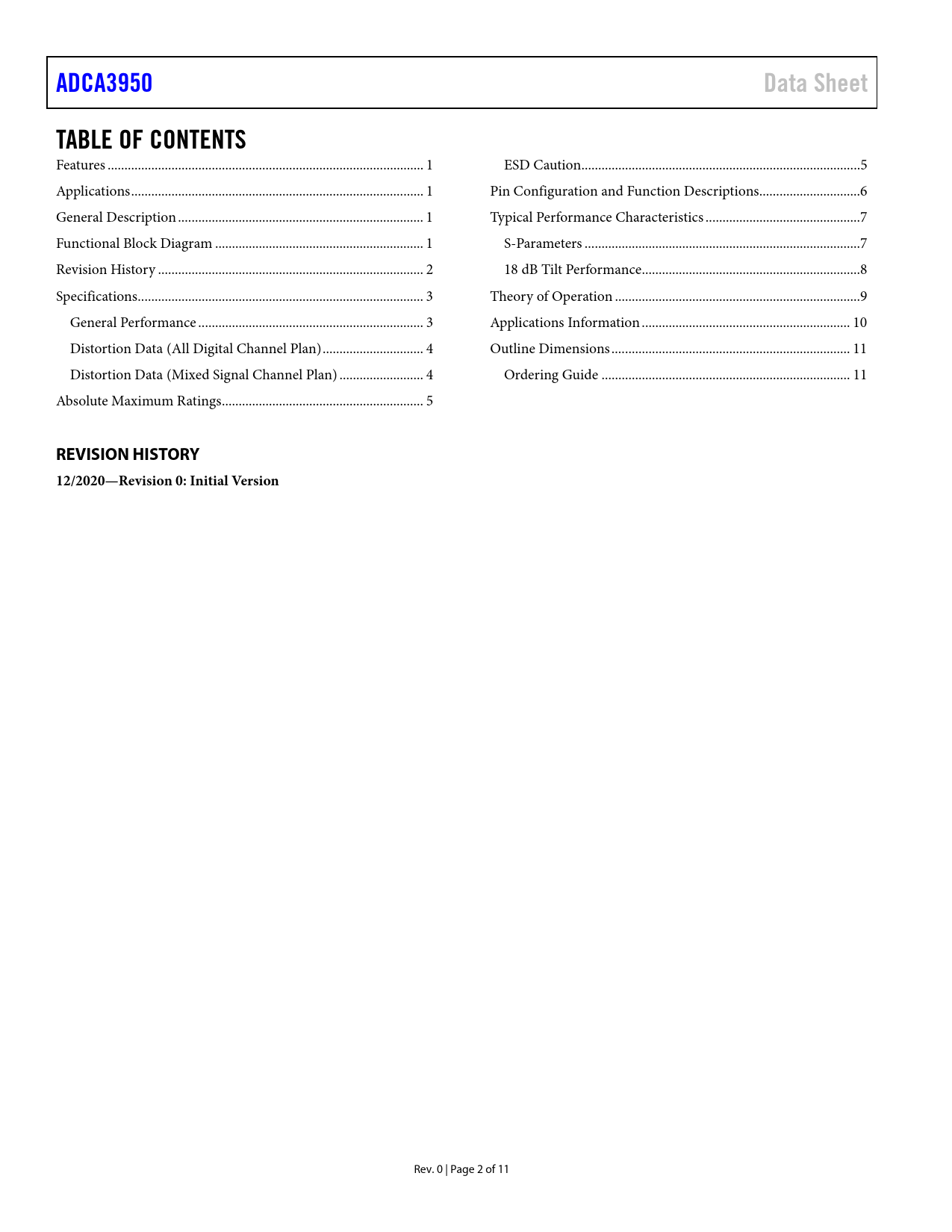 link to page 1 link to page 1 link to page 1 link to page 1 link to page 2 link to page 3 link to page 3 link to page 4 link to page 4 link to page 5 link to page 5 link to page 6 link to page 7 link to page 7 link to page 8 link to page 9 link to page 10 link to page 11 link to page 11 ADCA3950Data SheetTABLE OF CONTENTS Features .. 1 ESD Caution...5 Applications ... 1 Pin Configuration and Function Descriptions ..6 General Description ... 1 Typical Performance Characteristics ..7 Functional Block Diagram .. 1 S-Parameters ..7 Revision History ... 2 18 dB Tilt Performance ...8 Specifications ... 3 Theory of Operation ...9 General Performance ... 3 Applications Information .. 10 Distortion Data (Al Digital Channel Plan) .. 4 Outline Dimensions ... 11 Distortion Data (Mixed Signal Channel Plan) ... 4 Ordering Guide .. 11 Absolute Maximum Ratings .. 5 REVISION HISTORY 12/2020—Revision 0: Initial Version Rev. 0 | Page 2 of 11 Document Outline FEATURES APPLICATIONS GENERAL DESCRIPTION FUNCTIONAL BLOCK DIAGRAM TABLE OF CONTENTS REVISION HISTORY SPECIFICATIONS GENERAL PERFORMANCE DISTORTION DATA (ALL DIGITAL CHANNEL PLAN) DISTORTION DATA (MIXED SIGNAL CHANNEL PLAN) ABSOLUTE MAXIMUM RATINGS ESD CAUTION PIN CONFIGURATION AND FUNCTION DESCRIPTIONS TYPICAL PERFORMANCE CHARACTERISTICS S-PARAMETERS 18 dB TILT PERFORMANCE THEORY OF OPERATION APPLICATIONS INFORMATION OUTLINE DIMENSIONS ORDERING GUIDE