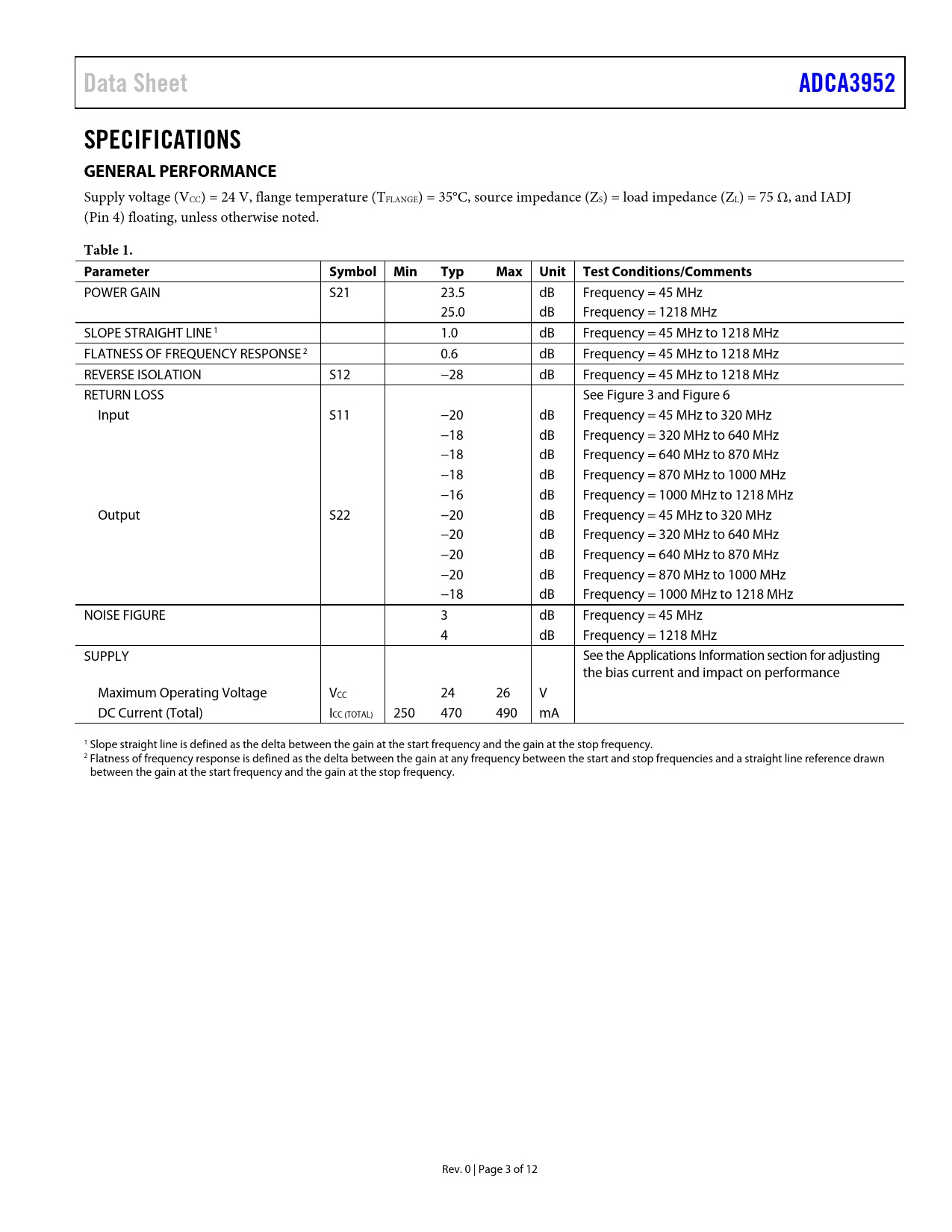 link to page 7 link to page 7 link to page 10 Data SheetADCA3952SPECIFICATIONS GENERAL PERFORMANCE Supply voltage (VCC) = 24 V, flange temperature (TFLANGE) = 35°C, source impedance (ZS) = load impedance (ZL) = 75 Ω, and IADJ (Pin 4) floating, unless otherwise noted. Table 1. ParameterSymbol MinTypMax Unit Test Conditions/Comments POWER GAIN S21 23.5 dB Frequency = 45 MHz 25.0 dB Frequency = 1218 MHz SLOPE STRAIGHT LINE1 1.0 dB Frequency = 45 MHz to 1218 MHz FLATNESS OF FREQUENCY RESPONSE2 0.6 dB Frequency = 45 MHz to 1218 MHz REVERSE ISOLATION S12 −28 dB Frequency = 45 MHz to 1218 MHz RETURN LOSS See Figure 3 and Figure 6 Input S11 −20 dB Frequency = 45 MHz to 320 MHz −18 dB Frequency = 320 MHz to 640 MHz −18 dB Frequency = 640 MHz to 870 MHz −18 dB Frequency = 870 MHz to 1000 MHz −16 dB Frequency = 1000 MHz to 1218 MHz Output S22 −20 dB Frequency = 45 MHz to 320 MHz −20 dB Frequency = 320 MHz to 640 MHz −20 dB Frequency = 640 MHz to 870 MHz −20 dB Frequency = 870 MHz to 1000 MHz −18 dB Frequency = 1000 MHz to 1218 MHz NOISE FIGURE 3 dB Frequency = 45 MHz 4 dB Frequency = 1218 MHz SUPPLY See the Applications Information section for adjusting the bias current and impact on performance Maximum Operating Voltage VCC 24 26 V DC Current (Total) ICC (TOTAL) 250 470 490 mA 1 Slope straight line is defined as the delta between the gain at the start frequency and the gain at the stop frequency. 2 Flatness of frequency response is defined as the delta between the gain at any frequency between the start and stop frequencies and a straight line reference drawn between the gain at the start frequency and the gain at the stop frequency. Rev. 0 | Page 3 of 12 Document Outline FEATURES APPLICATIONS GENERAL DESCRIPTION FUNCTIONAL BLOCK DIAGRAM TABLE OF CONTENTS REVISION HISTORY SPECIFICATIONS GENERAL PERFORMANCE DISTORTION DATA (40 MHz TO 550 MHz), ERROR RATES, AND TOTAL COMPOSITE POWER ABSOLUTE MAXIMUM RATINGS ESD CAUTION PIN CONFIGURATION AND FUNCTION DESCRIPTIONS TYPICAL PERFORMANCE CHARACTERISTICS S-PARAMETERS 9 dB TILT PERFORMANCE THEORY OF OPERATION APPLICATIONS INFORMATION OUTLINE DIMENSIONS ORDERING GUIDE