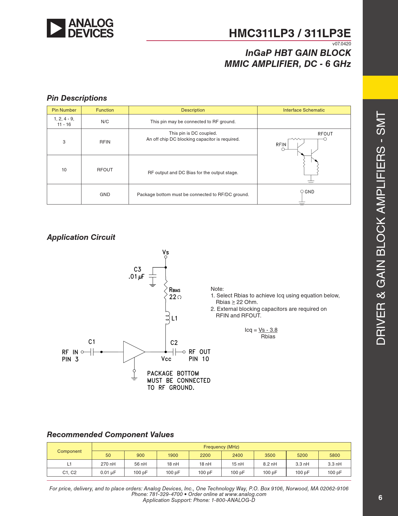 HMC311LP3 / 311LP3E v07.0420 InGaP HBT GAIN BLOCKMMIC AMPLIFIER, DC - 6 GHzPin Descriptions Pin Number Function Description Interface Schematic 1, 2, 4 - 9, T N/C This pin may be connected to RF ground. 11 - 16 M This pin is DC coupled. An off chip DC blocking capacitor is required. 3 RFIN S - S R 10 RFOUT RF output and DC Bias for the output stage. IE LIF GND Package bottom must be connected to RF/DC ground. P M K A C Application Circuit LO IN B A Note: 1. Select Rbias to achieve Icq using equation below, Rbias > 22 Ohm. 2. External blocking capacitors are required on R & G RFIN and RFOUT. E IV Icq = Vs - 3.8 Rbias R D Recommended Component Values Frequency (MHz) Component 50 900 1900 2200 2400 3500 5200 5800 L1 270 nH 56 nH 18 nH 18 nH 15 nH 8.2 nH 3.3 nH 3.3 nH C1, C2 0.01 µF 100 pF 100 pF 100 pF 100 pF 100 pF 100 pF 100 pF For price, delivery, and to place orders: Analog Devices, Inc., One Technology Way, P.O. Box 9106, Norwood, MA 02062-9106 Phone: 781-329-4700 • Order online at www.analog.com Application Support: Phone: 1-800-ANALOG-D 6