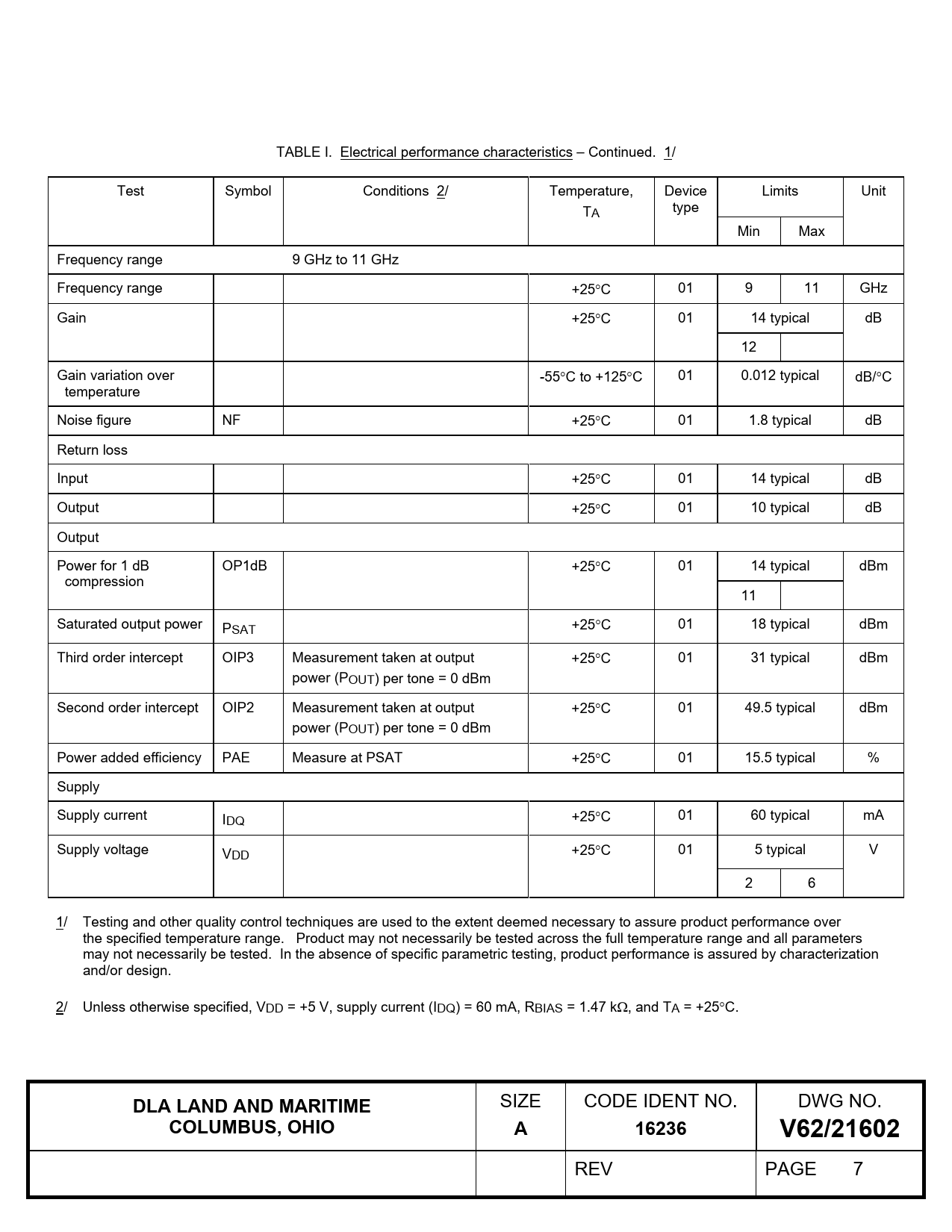 TABLE I. Electrical performance characteristics – Continued. 1/ Test Symbol Conditions 2/ Temperature, Device Limits Unit TA type Min Max Frequency range 9 GHz to 11 GHz Frequency range +25C 01 9 11 GHz Gain +25C 01 14 typical dB 12 Gain variation over -55C to +125C 01 0.012 typical dB/C temperature Noise figure NF +25C 01 1.8 typical dB Return loss Input +25C 01 14 typical dB Output +25C 01 10 typical dB Output Power for 1 dB OP1dB +25C 01 14 typical dBm compression 11 Saturated output power PSAT +25C 01 18 typical dBm Third order intercept OIP3 Measurement taken at output +25C 01 31 typical dBm power (POUT) per tone = 0 dBm Second order intercept OIP2 Measurement taken at output +25C 01 49.5 typical dBm power (POUT) per tone = 0 dBm Power added efficiency PAE Measure at PSAT +25C 01 15.5 typical % Supply Supply current IDQ +25C 01 60 typical mA Supply voltage VDD +25C 01 5 typical V 2 6 1/ Testing and other quality control techniques are used to the extent deemed necessary to assure product performance over the specified temperature range. Product may not necessarily be tested across the full temperature range and all parameters may not necessarily be tested. In the absence of specific parametric testing, product performance is assured by characterization and/or design. 2/ Unless otherwise specified, VDD = +5 V, supply current (IDQ) = 60 mA, RBIAS = 1.47 k, and TA = +25C.