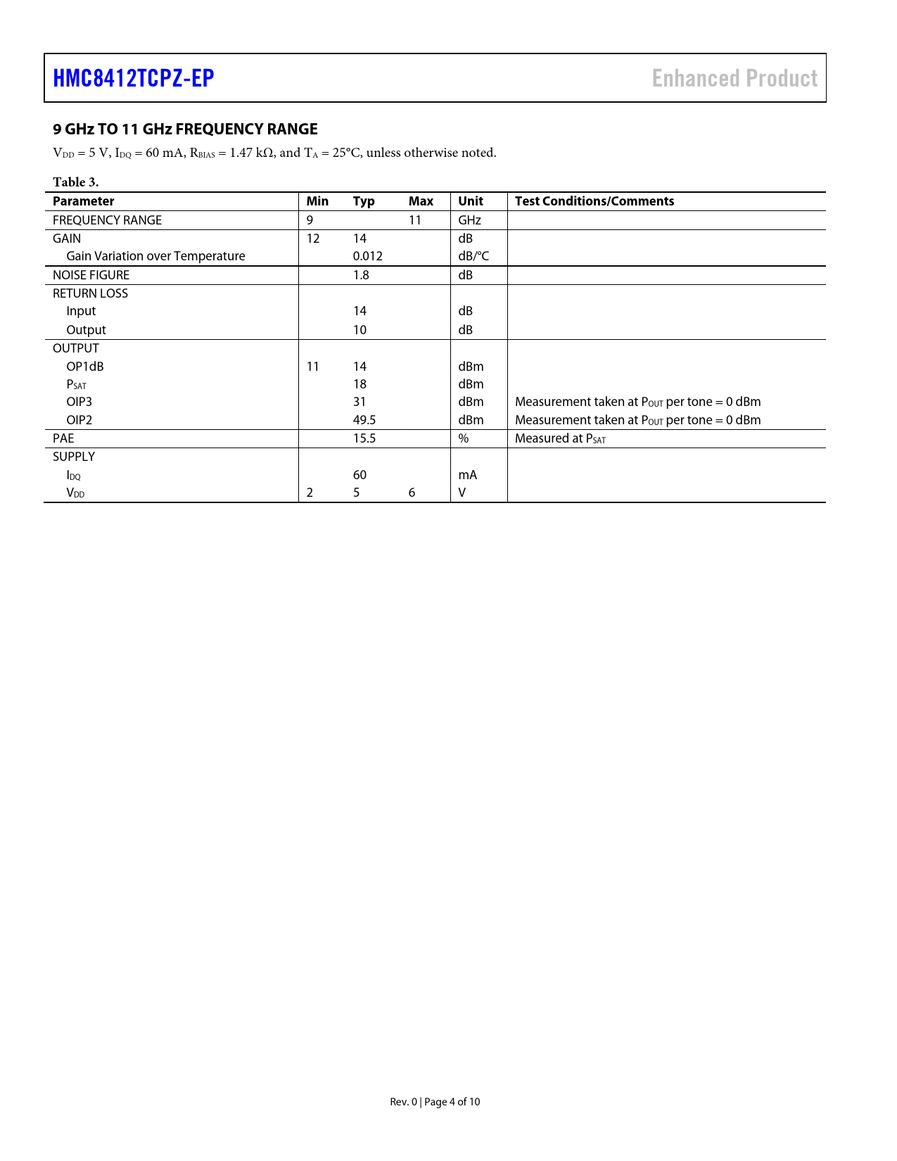 HMC8412TCPZ-EP. Enhanced Product. 9 GHz TO 11 GHz FREQUENCY RANGE. Table 3. Parameter. Min. Typ. Max. Unit. Test Conditions/Comments