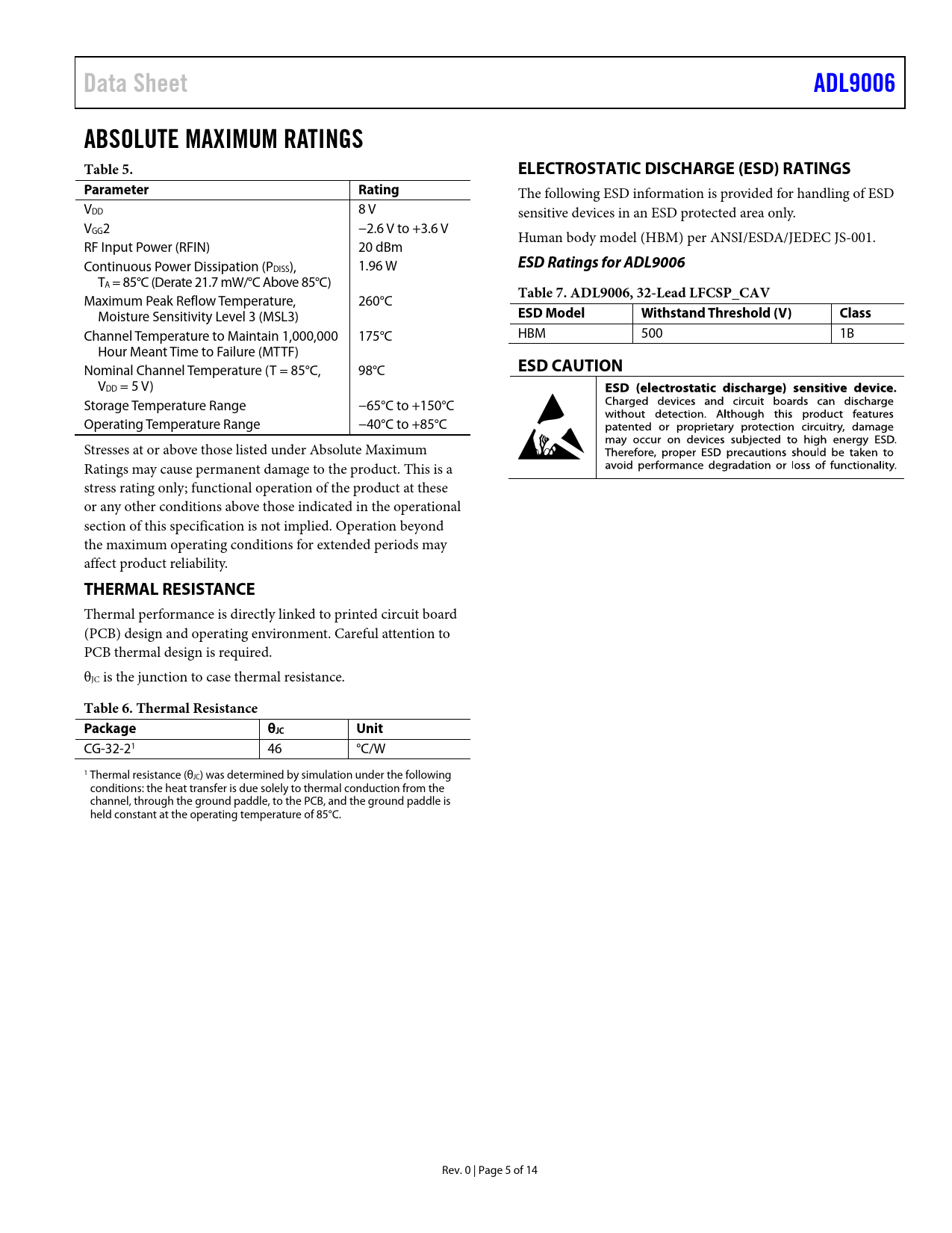 Data SheetADL9006ABSOLUTE MAXIMUM RATINGS Table 5.ELECTROSTATIC DISCHARGE (ESD) RATINGSParameterRating The following ESD information is provided for handling of ESD VDD 8 V sensitive devices in an ESD protected area only. VGG2 −2.6 V to +3.6 V Human body model (HBM) per ANSI/ESDA/JEDEC JS-001. RF Input Power (RFIN) 20 dBm Continuous Power Dissipation (P ESD Ratings for ADL9006 DISS), 1.96 W TA = 85°C (Derate 21.7 mW/°C Above 85°C) Maximum Peak Reflow Temperature, 260°C Table 7. ADL9006, 32-Lead LFCSP_CAV Moisture Sensitivity Level 3 (MSL3) ESD ModelWithstand Threshold (V)Class Channel Temperature to Maintain 1,000,000 175°C HBM 500 1B Hour Meant Time to Failure (MTTF) Nominal Channel Temperature (T = 85°C, 98°C ESD CAUTION VDD = 5 V) Storage Temperature Range −65°C to +150°C Operating Temperature Range −40°C to +85°C Stresses at or above those listed under Absolute Maximum Ratings may cause permanent damage to the product. This is a stress rating only; functional operation of the product at these or any other conditions above those indicated in the operational section of this specification is not implied. Operation beyond the maximum operating conditions for extended periods may affect product reliability. THERMAL RESISTANCE Thermal performance is directly linked to printed circuit board (PCB) design and operating environment. Careful attention to PCB thermal design is required. θ JC is the junction to case thermal resistance. Table 6. Thermal ResistancePackageθJCUnit CG-32-21 46 °C/W 1 Thermal resistance (θ JC) was determined by simulation under the following conditions: the heat transfer is due solely to thermal conduction from the channel, through the ground paddle, to the PCB, and the ground paddle is held constant at the operating temperature of 85°C. Rev. 0 | Page 5 of 14 Document Outline Features Applications Functional Block Diagram General Description Revision History Specifications 2 GHz to 6 GHz 6 GHz to 20 GHz 20 GHz to 28 GHz DC Specifications Absolute Maximum Ratings Electrostatic Discharge (ESD) Ratings ESD Ratings for ADL9006 ESD Caution Pin Configuration and Function Descriptions Interface Schematics Typical Performance Characteristics Theory of Operation Applications Information Biasing Procedures Outline Dimensions Ordering Guide