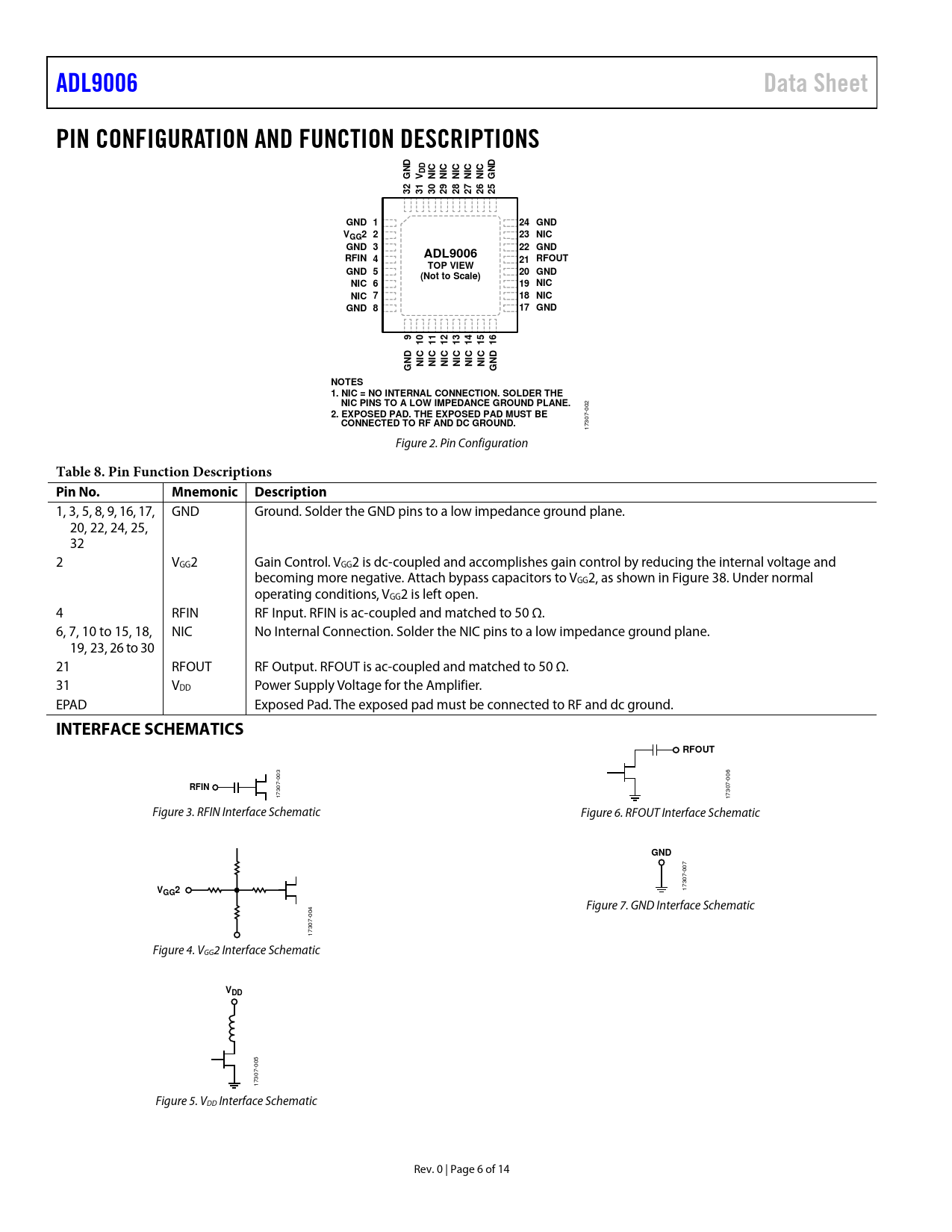 ADL9006. Data Sheet. PIN CONFIGURATION AND FUNCTION DESCRIPTIONS. GND 1. 24 GND. GG2. 23 NIC. GND 3. 22 GND. RFIN 4. 21 RFOUT. TOP VIEW. GND 5