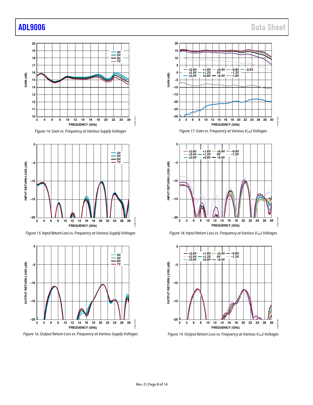17307- Figure 16. Output Return Loss vs. Frequency at Various Supply Voltages Figure 19. Output Return Loss vs. Frequency at Various VGG2 Voltages Rev. 0 | Page 8 of 14 Document Outline Features Applications Functional Block Diagram General Description Revision History Specifications 2 GHz to 6 GHz 6 GHz to 20 GHz 20 GHz to 28 GHz DC Specifications Absolute Maximum Ratings Electrostatic Discharge (ESD) Ratings ESD Ratings for ADL9006 ESD Caution Pin Configuration and Function Descriptions Interface Schematics Typical Performance Characteristics Theory of Operation Applications Information Biasing Procedures Outline Dimensions Ordering Guide