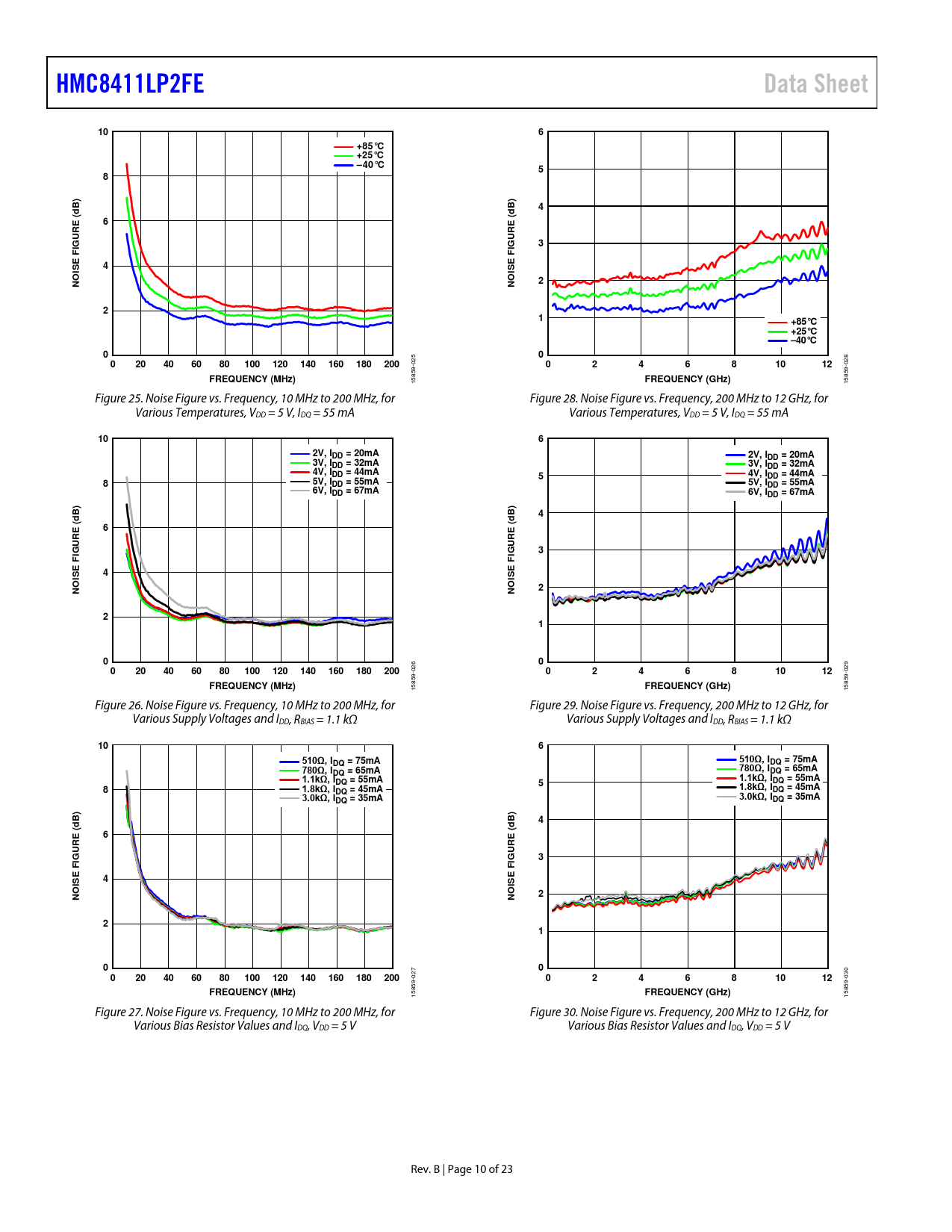 15859- Figure 26. Noise Figure vs. Frequency, 10 MHz to 200 MHz, for Figure 29. Noise Figure vs. Frequency, 200 MHz to 12 GHz, for Various Supply Voltages and IDD, RBIAS = 1.1 kΩ Various Supply Voltages and IDD, RBIAS = 1.1 kΩ