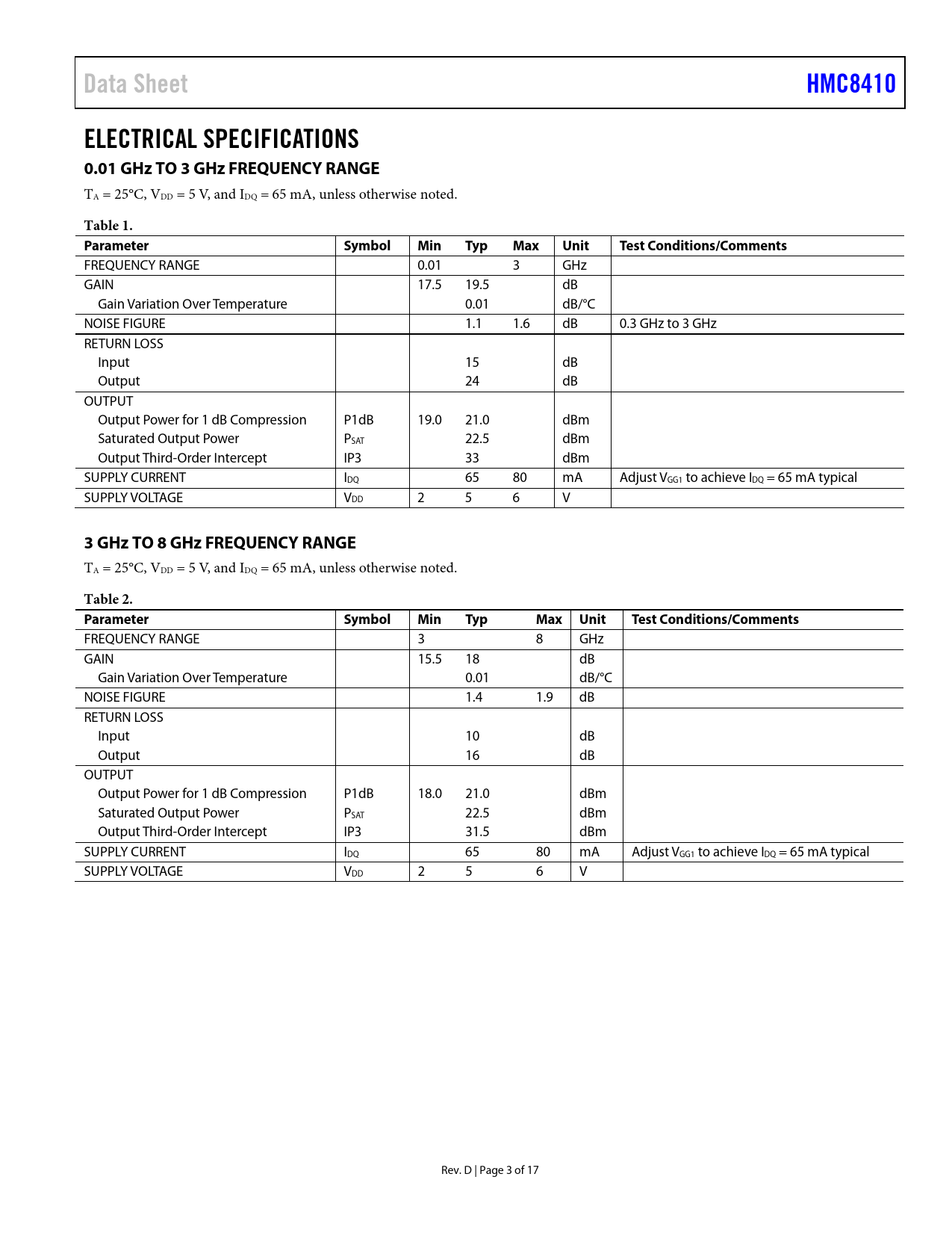 Data SheetHMC8410ELECTRICAL SPECIFICATIONS 0.01 GHz TO 3 GHz FREQUENCY RANGE TA = 25°C, VDD = 5 V, and IDQ = 65 mA, unless otherwise noted. Table 1. ParameterSymbolMinTypMaxUnitTest Conditions/Comments FREQUENCY RANGE 0.01 3 GHz GAIN 17.5 19.5 dB Gain Variation Over Temperature 0.01 dB/°C NOISE FIGURE 1.1 1.6 dB 0.3 GHz to 3 GHz RETURN LOSS Input 15 dB Output 24 dB OUTPUT Output Power for 1 dB Compression P1dB 19.0 21.0 dBm Saturated Output Power PSAT 22.5 dBm Output Third-Order Intercept IP3 33 dBm SUPPLY CURRENT IDQ 65 80 mA Adjust VGG1 to achieve IDQ = 65 mA typical SUPPLY VOLTAGE VDD 2 5 6 V 3 GHz TO 8 GHz FREQUENCY RANGE TA = 25°C, VDD = 5 V, and IDQ = 65 mA, unless otherwise noted. Table 2. ParameterSymbolMinTypMax UnitTest Conditions/Comments FREQUENCY RANGE 3 8 GHz GAIN 15.5 18 dB Gain Variation Over Temperature 0.01 dB/°C NOISE FIGURE 1.4 1.9 dB RETURN LOSS Input 10 dB Output 16 dB OUTPUT Output Power for 1 dB Compression P1dB 18.0 21.0 dBm Saturated Output Power PSAT 22.5 dBm Output Third-Order Intercept IP3 31.5 dBm SUPPLY CURRENT IDQ 65 80 mA Adjust VGG1 to achieve IDQ = 65 mA typical SUPPLY VOLTAGE VDD 2 5 6 V Rev. D | Page 3 of 17 Document Outline FEATURES APPLICATIONS FUNCTIONAL BLOCK DIAGRAM GENERAL DESCRIPTION REVISION HISTORY ELECTRICAL SPECIFICATIONS 0.01 GHz TO 3 GHz FREQUENCY RANGE 3 GHz TO 8 GHz FREQUENCY RANGE 8 GHz TO 10 GHz FREQUENCY RANGE ABSOLUTE MAXIMUM RATINGS ESD CAUTION PIN CONFIGURATION AND FUNCTION DESCRIPTIONS INTERFACE SCHEMATICS TYPICAL PERFORMANCE CHARACTERISTICS THEORY OF OPERATION APPLICATIONS INFORMATION RECOMMENDED BIAS SEQUENCING During Power-Up During Power-Down TYPICAL APPLICATION CIRCUIT EVALUATION BOARD EVALUATION BOARD SCHEMATIC OUTLINE DIMENSIONS ORDERING GUIDE