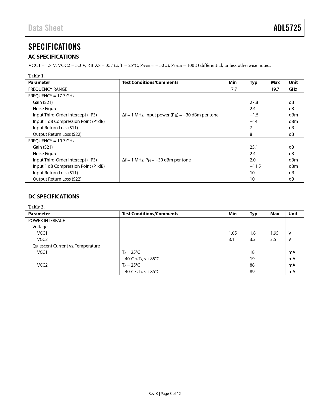 Data SheetADL5725SPECIFICATIONS AC SPECIFICATIONS VCC1 = 1.8 V, VCC2 = 3.3 V, RBIAS = 357 Ω, T = 25°C, ZSOURCE = 50 Ω, ZLOAD = 100 Ω differential, unless otherwise noted. Table 1. ParameterTest Conditions/CommentsMinTypMaxUnit FREQUENCY RANGE 17.7 19.7 GHz FREQUENCY = 17.7 GHz Gain (S21) 27.8 dB Noise Figure 2.4 dB Input Third-Order Intercept (IIP3) Δf = 1 MHz, input power (PIN) = −30 dBm per tone −1.5 dBm Input 1 dB Compression Point (P1dB) −14 dBm Input Return Loss (S11) 7 dB Output Return Loss (S22) 8 dB FREQUENCY = 19.7 GHz Gain (S21) 25.1 dB Noise Figure 2.4 dB Input Third-Order Intercept (IIP3) Δf = 1 MHz, PIN = −30 dBm per tone 2.0 dBm Input 1 dB Compression Point (P1dB) −11.5 dBm Input Return Loss (S11) 10 dB Output Return Loss (S22) 10 dB DC SPECIFICATIONSTable 2. ParameterTest Conditions/CommentsMinTypMaxUnit POWER INTERFACE Voltage VCC1 1.65 1.8 1.95 V VCC2 3.1 3.3 3.5 V Quiescent Current vs. Temperature VCC1 TA = 25°C 18 mA −40°C ≤ TA ≤ +85°C 19 mA VCC2 TA = 25°C 88 mA −40°C ≤ TA ≤ +85°C 89 mA Rev. 0 | Page 3 of 12 Document Outline FEATURES APPLICATIONS FUNCTIONAL BLOCK DIAGRAM GENERAL DESCRIPTION TABLE OF CONTENTS REVISION HISTORY SPECIFICATIONS AC SPECIFICATIONS DC SPECIFICATIONS ABSOLUTE MAXIMUM RATINGS THERMAL RESISTANCE ESD CAUTION PIN CONFIGURATION AND FUNCTION DESCRIPTIONS TYPICAL PERFORMANCE CHARACTERISTICS THEORY OF OPERATION APPLICATIONS INFORMATION LAYOUT DIFFERENTIAL vs. SINGLE-ENDED OUTPUT EVALUATION BOARD INITIAL SETUP RESULTS BASIC CONNECTIONS FOR OPERATION OUTLINE DIMENSIONS ORDERING GUIDE