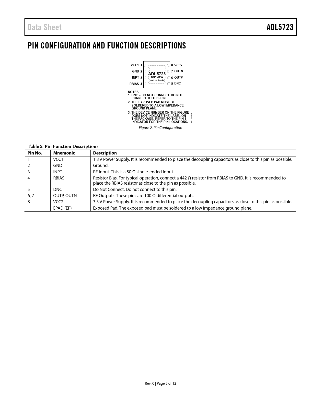 Data Sheet ADL5723 PIN CONFIGURATION AND FUNCTION DESCRIPTIONS VCC1 1 8 VCC2 GND 2 7 OUTN ADL5723 INPT 3 TOP VIEW 6 OUTP (Not to Scale) RBIAS 4 5 DNC NOTES 1. DNC = DO NOT CONNECT. DO NOT CONNECT TO THIS PIN. 2. THE EXPOSED PAD MUST BE SOLDERED TO A LOW IMPEDANCE GROUND PLANE. 3. THE DEVICE NUMBER ON THE FIGURE DOES NOT INDICATE THE LABEL ON