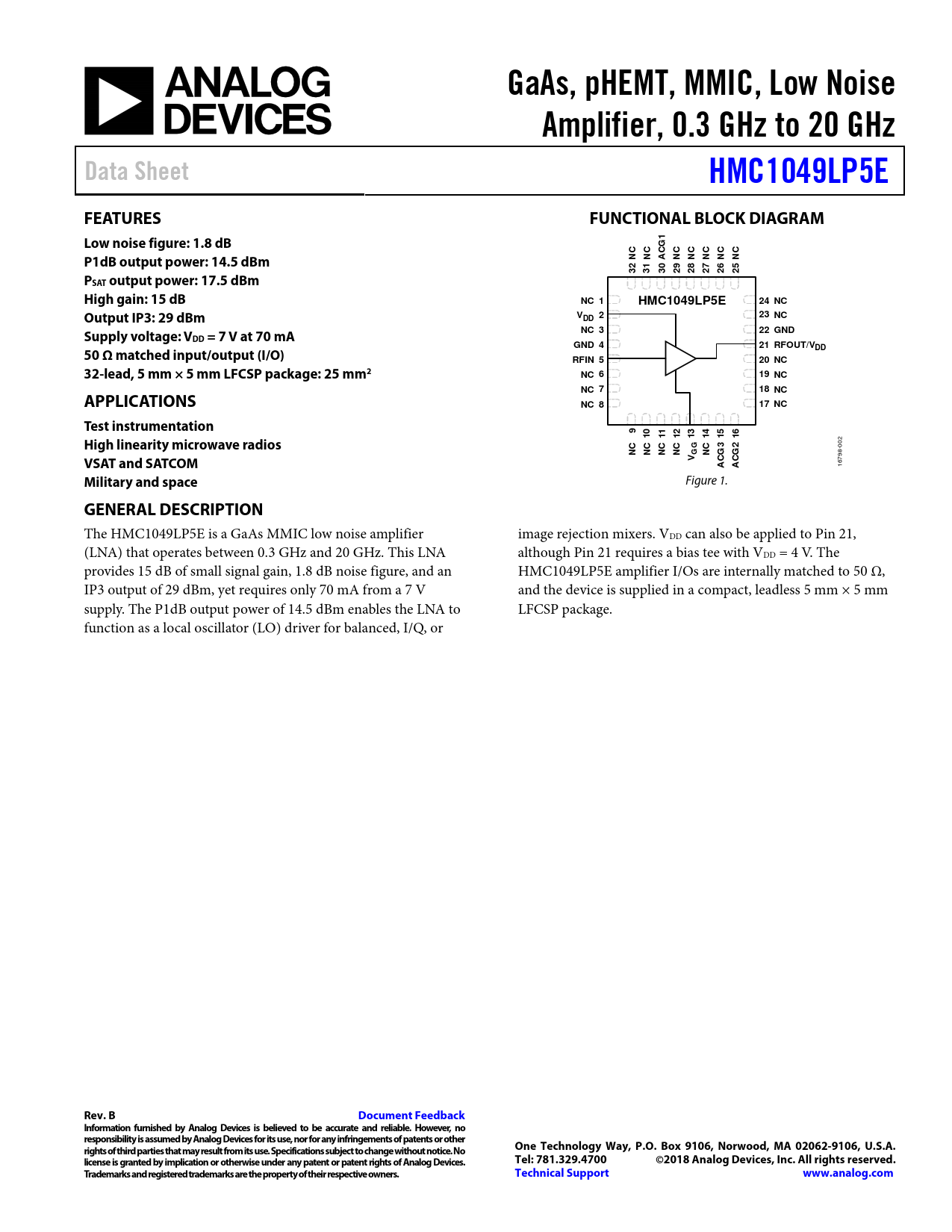 GaAs, pHEMT, MMIC, Low Noise. Amplifier, 0.3 GHz to 20 GHz. Data Sheet. HMC1049LP5E. FEATURES. FUNCTIONAL BLOCK DIAGRAM